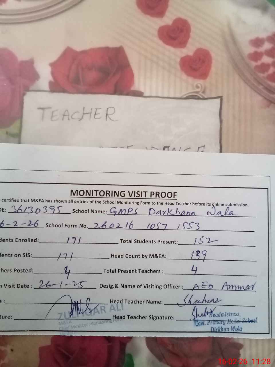 | Attendance Register | Head Teacher | MEA with School | Visit Proof |