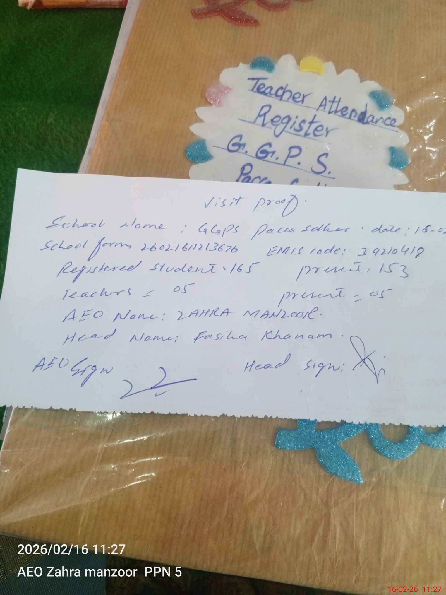 | Attendance Register | Head Teacher | MEA with School | Visit Proof |