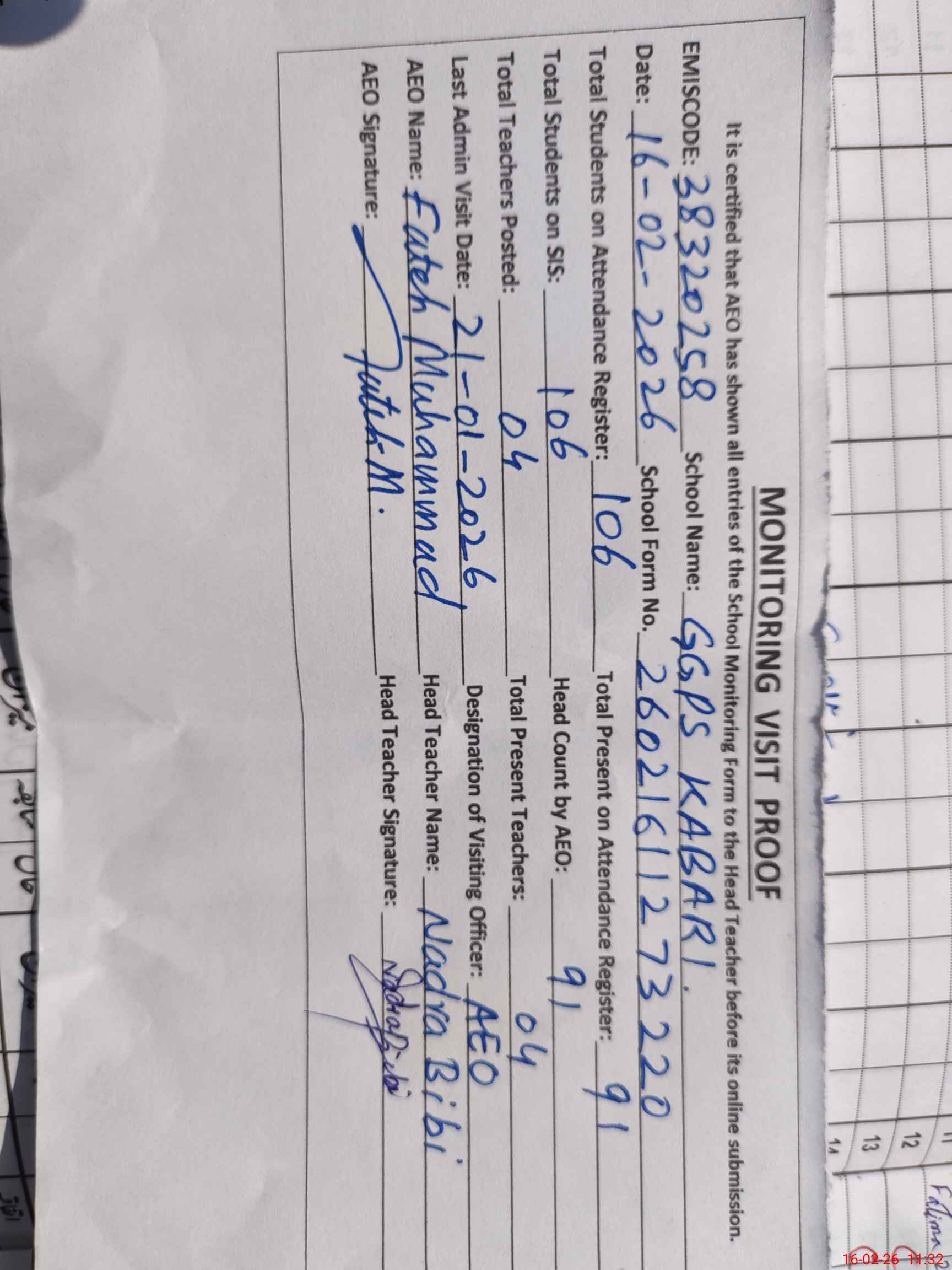 | Monitoring Date: 16-02-2026 | Start Time: 16-02-2026 10:50 AM | End Time: 16-02-2026 11:33 AM | Name of MEA: Fa**** Mu**** | |