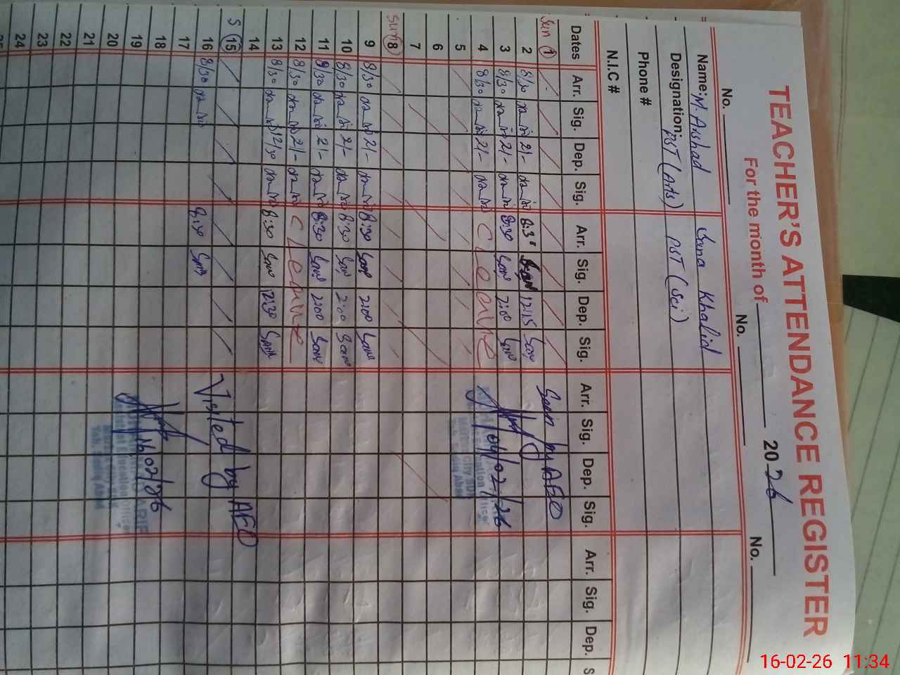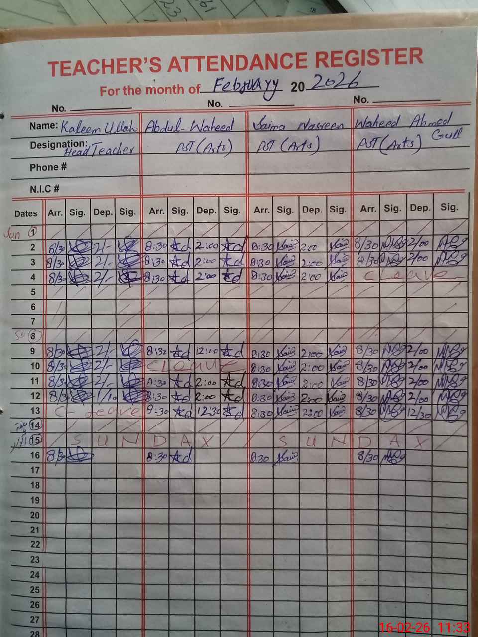 | CNIC | Full Name | Designation | R/C | Absence During Last Calender Month |