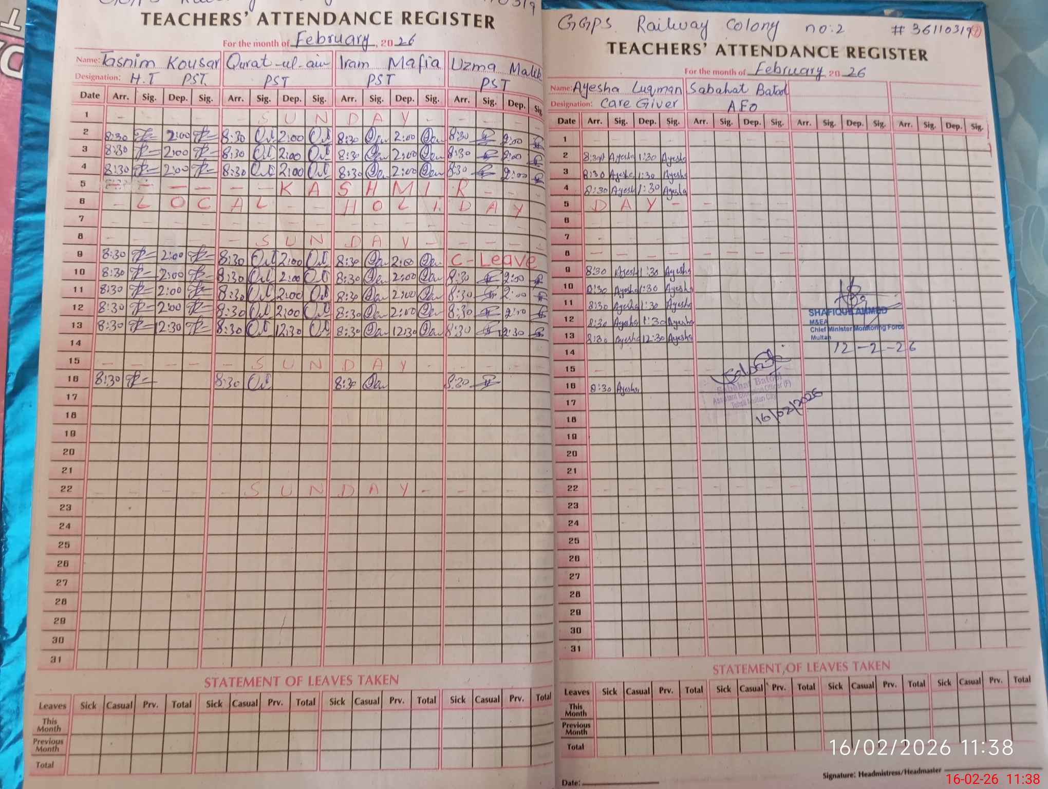 | EMIS Code: 36110319 | Name of School: GGPS RAILWAY COLONY NO: 2 | |||