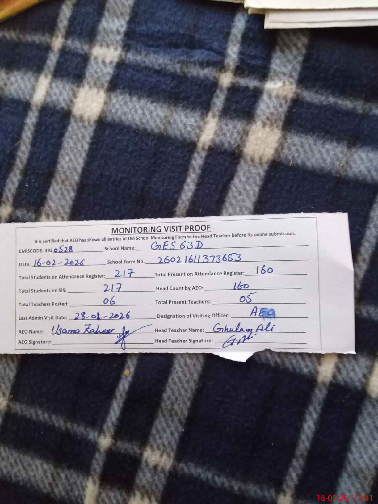 | EMIS Code: 39210528 | Name of School: GES CHAK NO. 63 D | |||