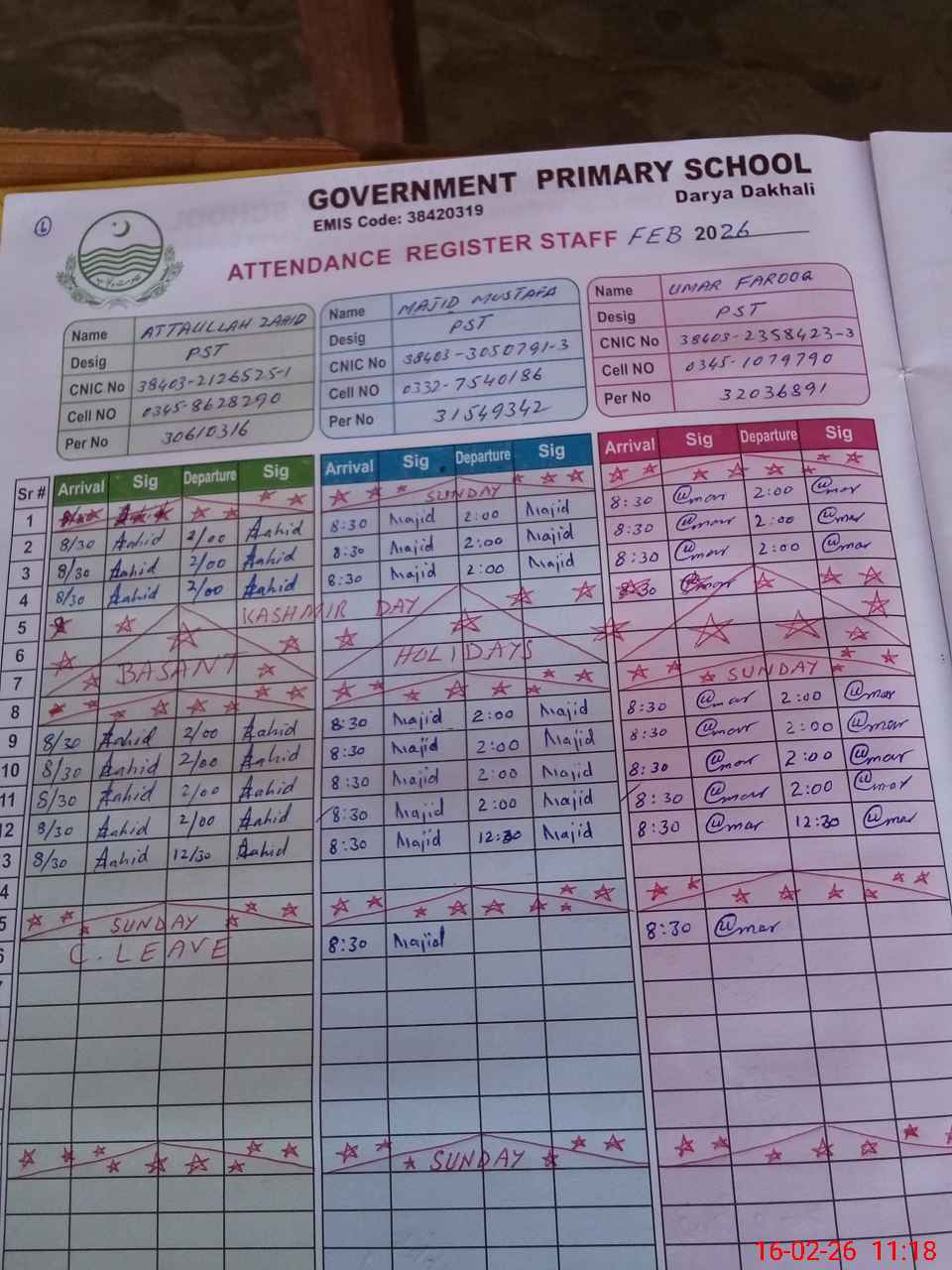 | CNIC | Full Name | Designation | R/C | Absence during last cal. month |