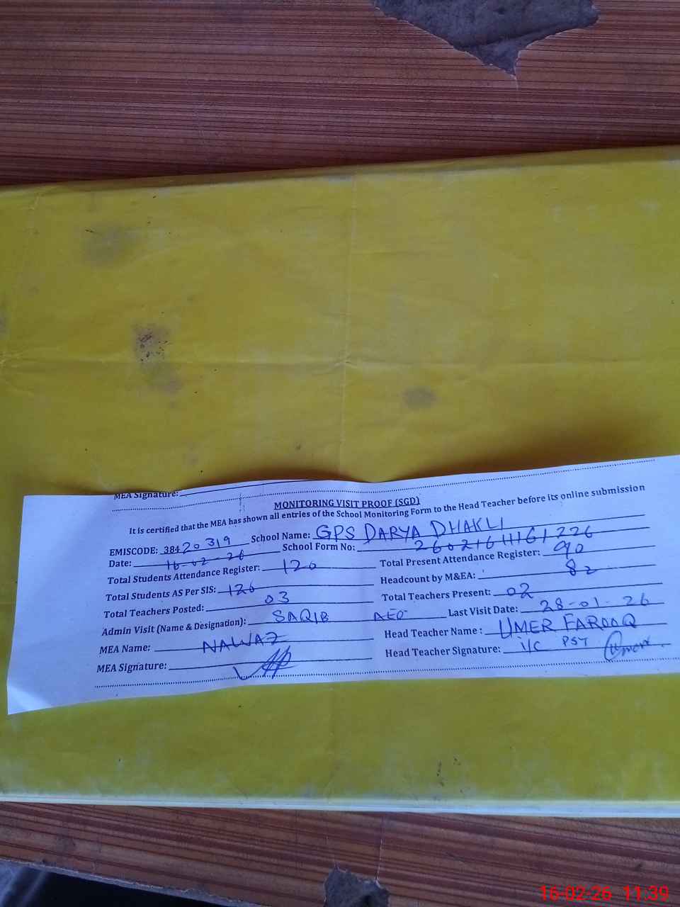 | Attendance Register | Head Teacher | MEA with School | Visit Proof |