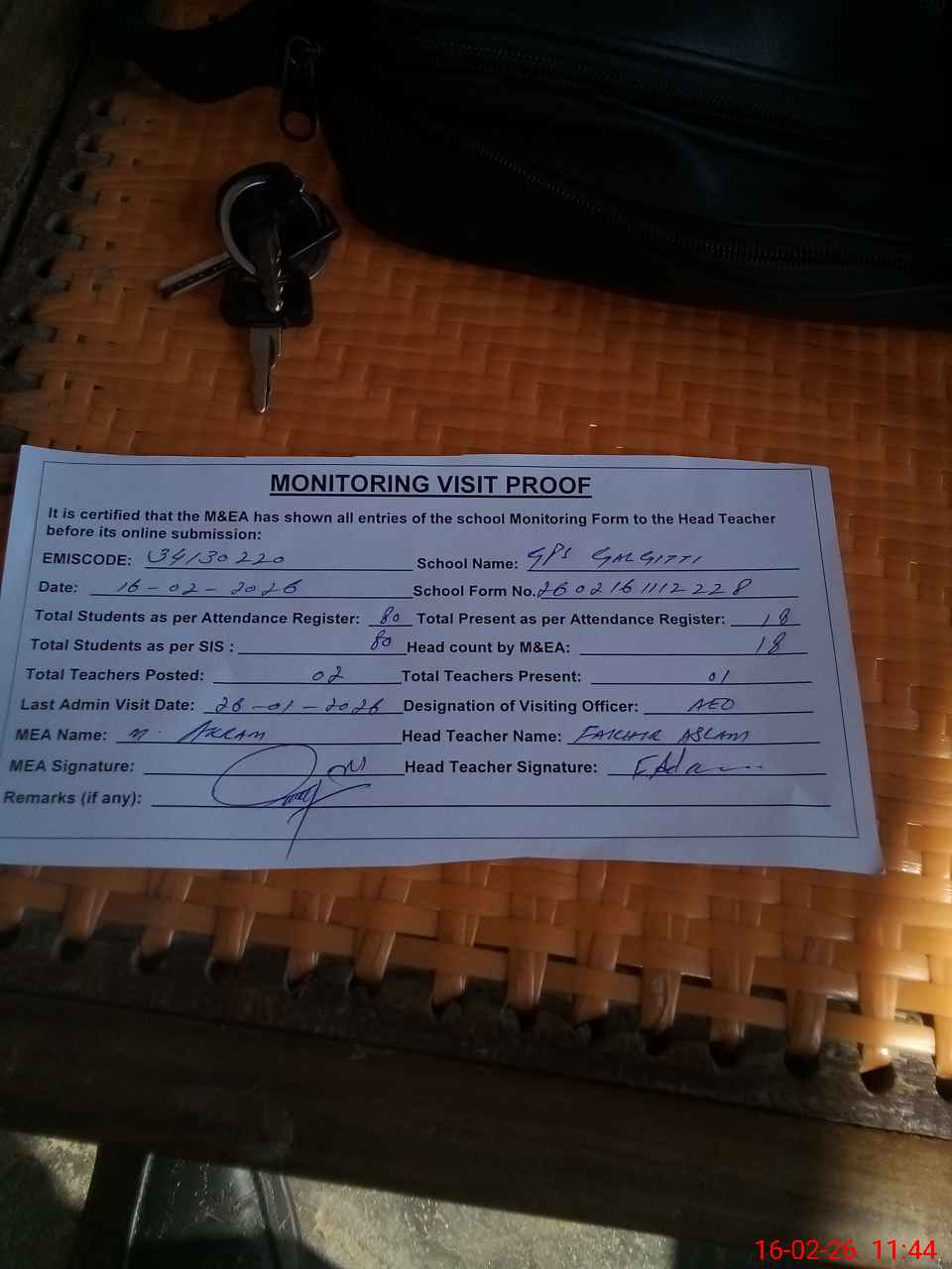 | Attendance Register | Head Teacher | MEA with School | Visit Proof |