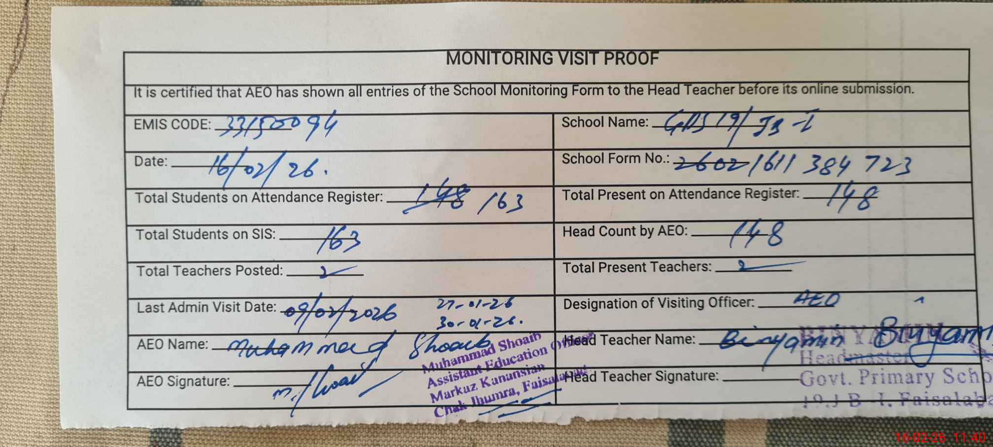 | Attendance Register | Head Teacher | MEA with School | Visit Proof |