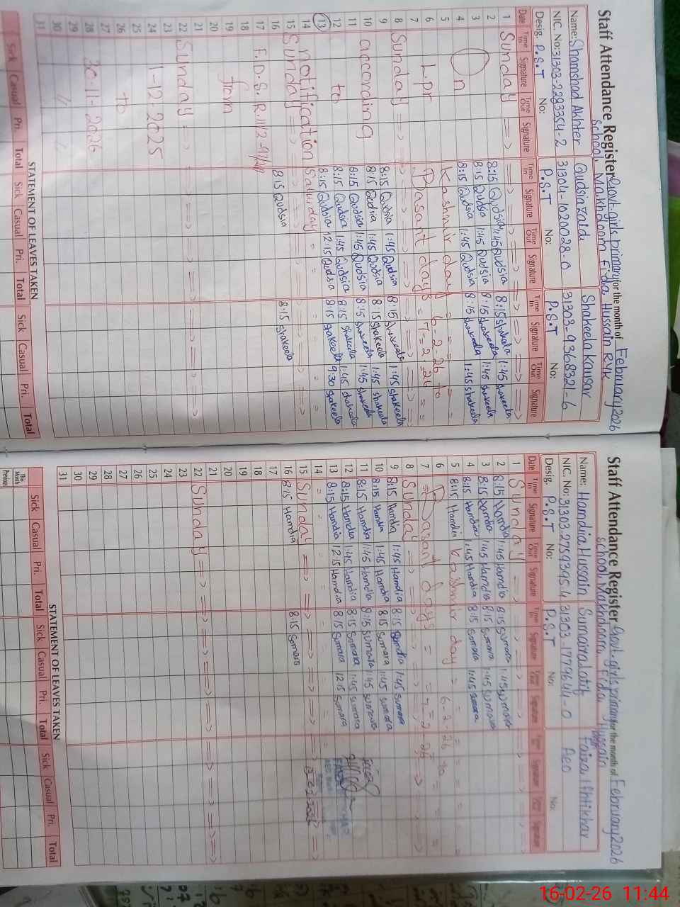 | CNIC | Full Name | Designation | R/C | Absence During Last Calender Month |
