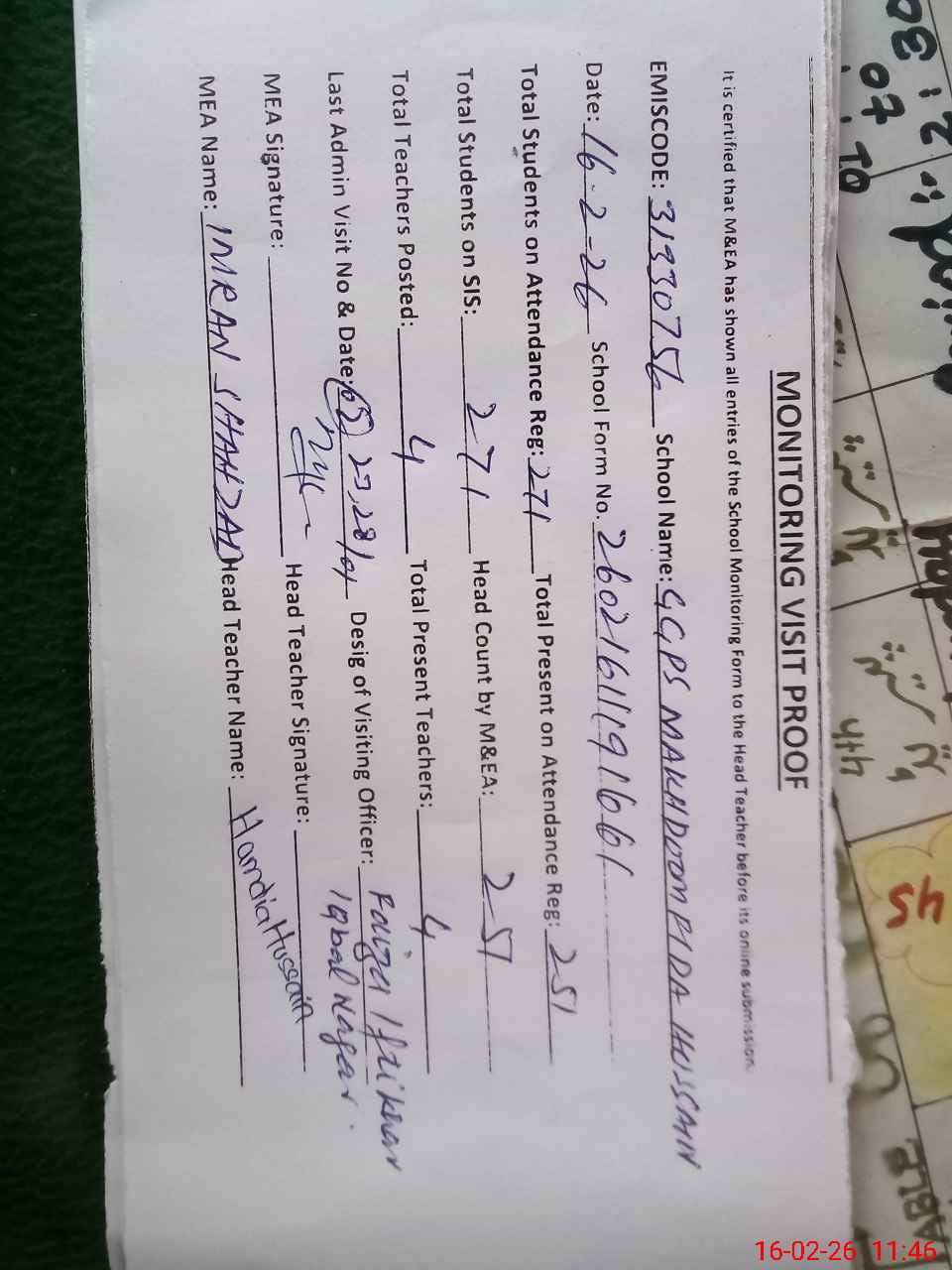 | Attendance Register | Head Teacher | MEA with School | Visit Proof |
