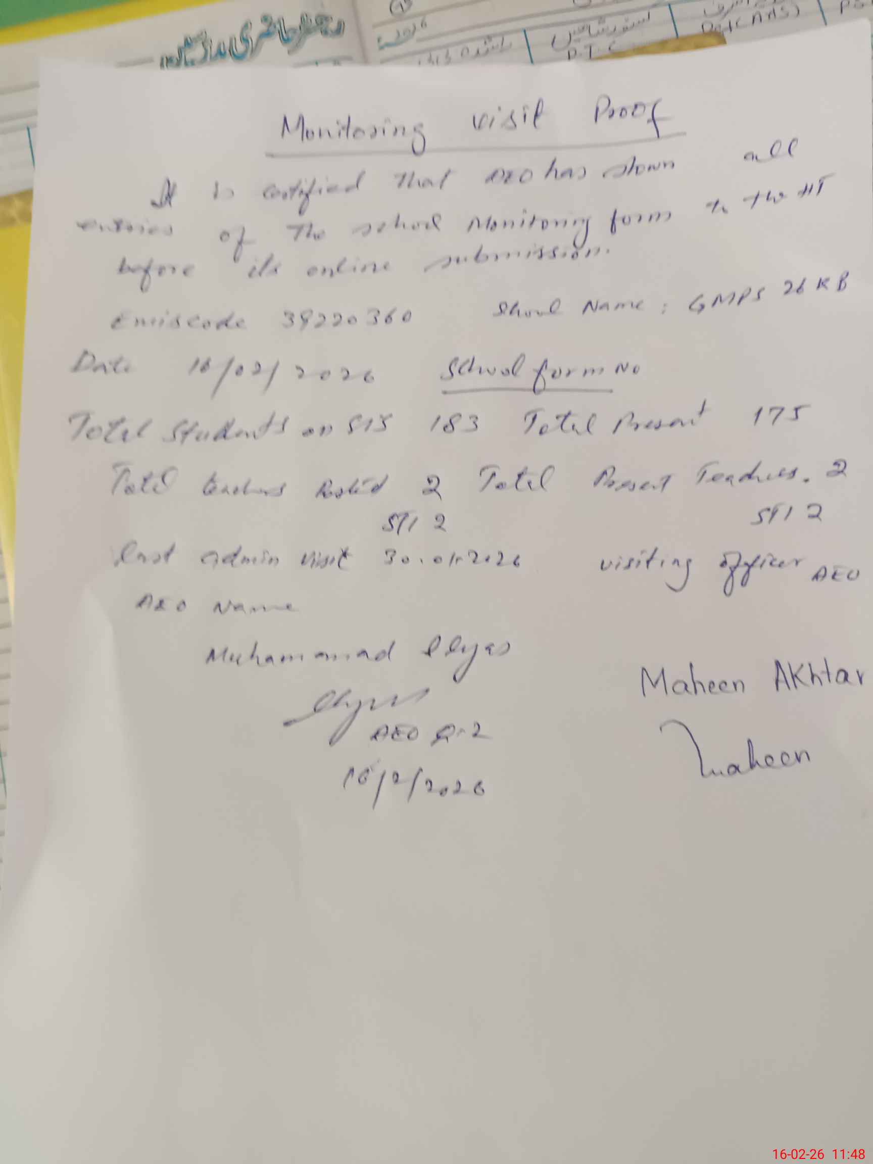 | Certified that this School was Inspected by the Undersigned MEA/DMO Today and the Information Stated Above is as Per Record. | |||||