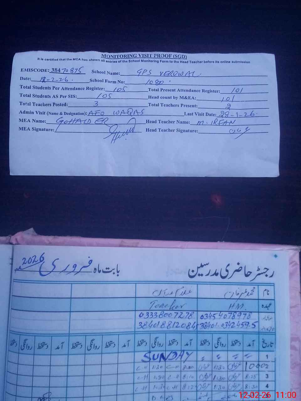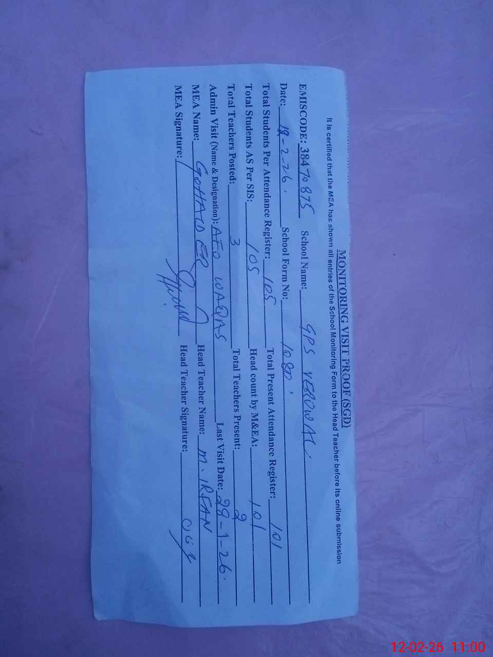 | Attendance Register | Head Teacher | MEA with School | Visit Proof |