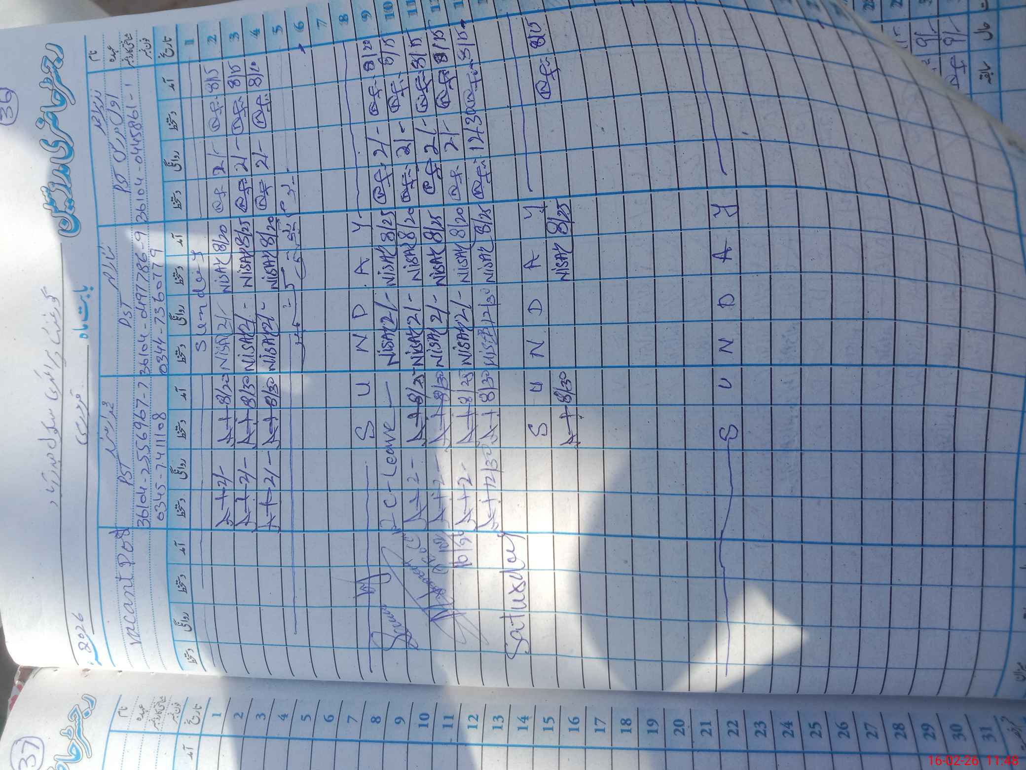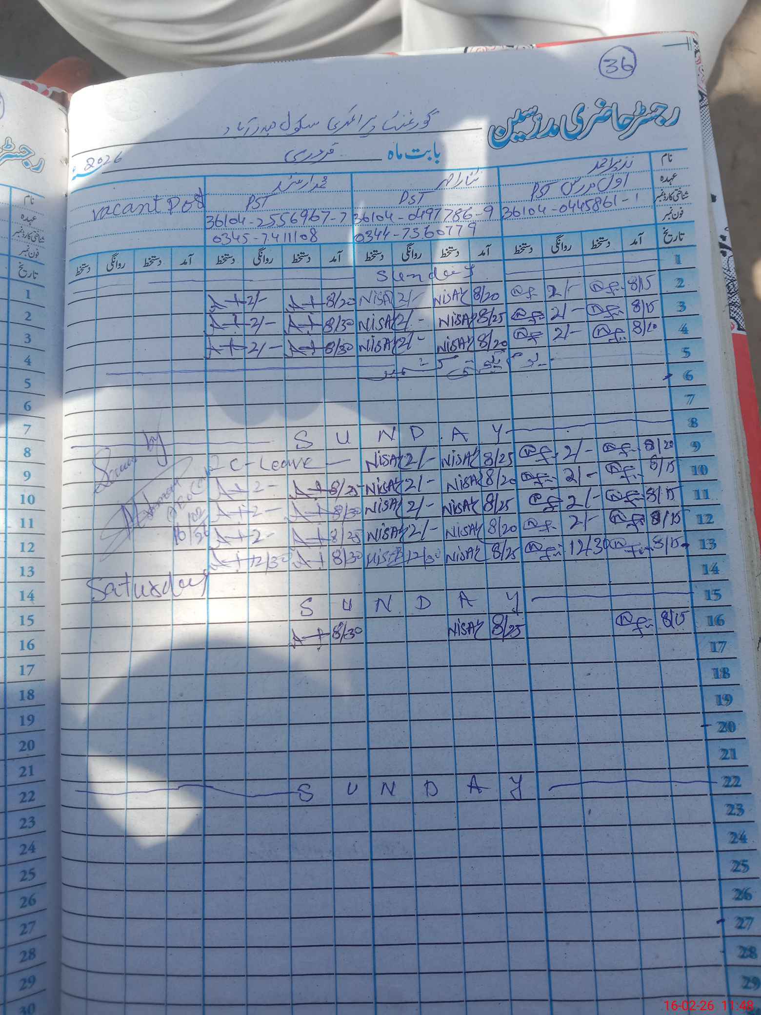 | CNIC | Full Name | Designation | R/C | Absence During Last Calender Month |