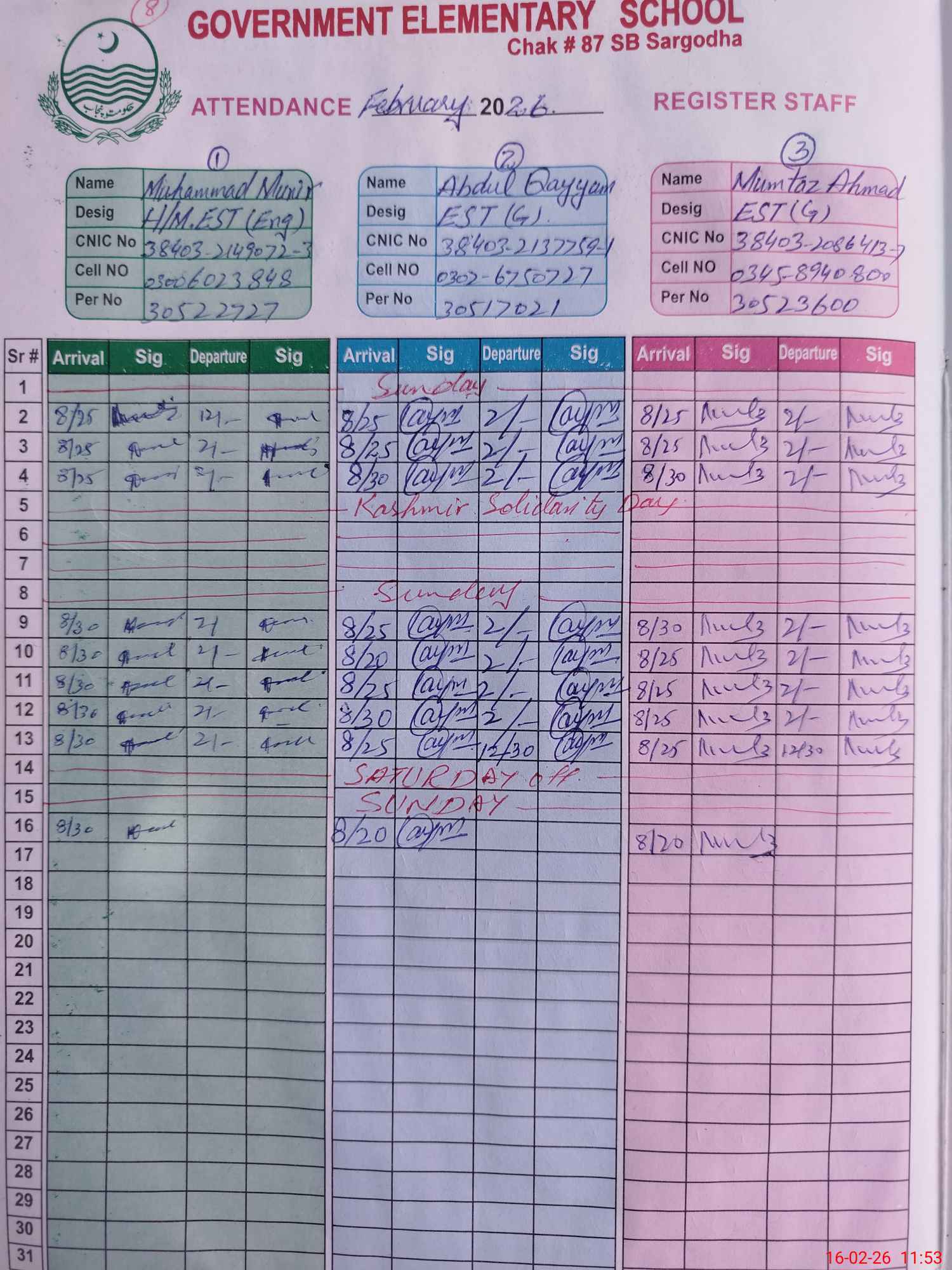 | CNIC | Full Name | Designation | R/C | Absence During Last Calender Month |