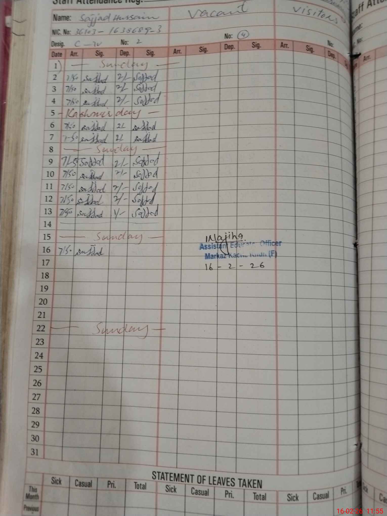 | CNIC | Full Name | Designation | R/C | Absence During Last Calender Month |
