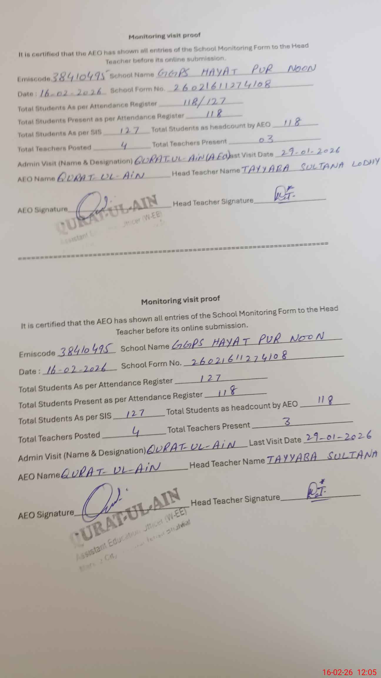 | Attendance Register | Head Teacher | MEA with School | Visit Proof |