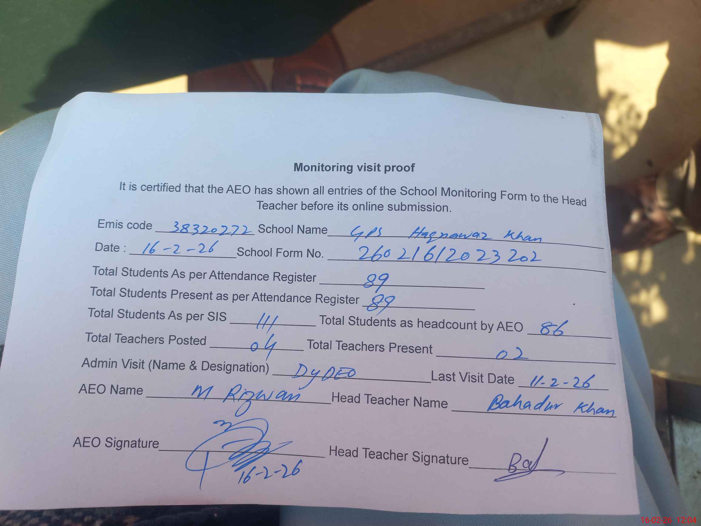 | EMIS Code: 38320272 | Name of School: GPS HAQ NAWAZ KHAN WALA | |||
