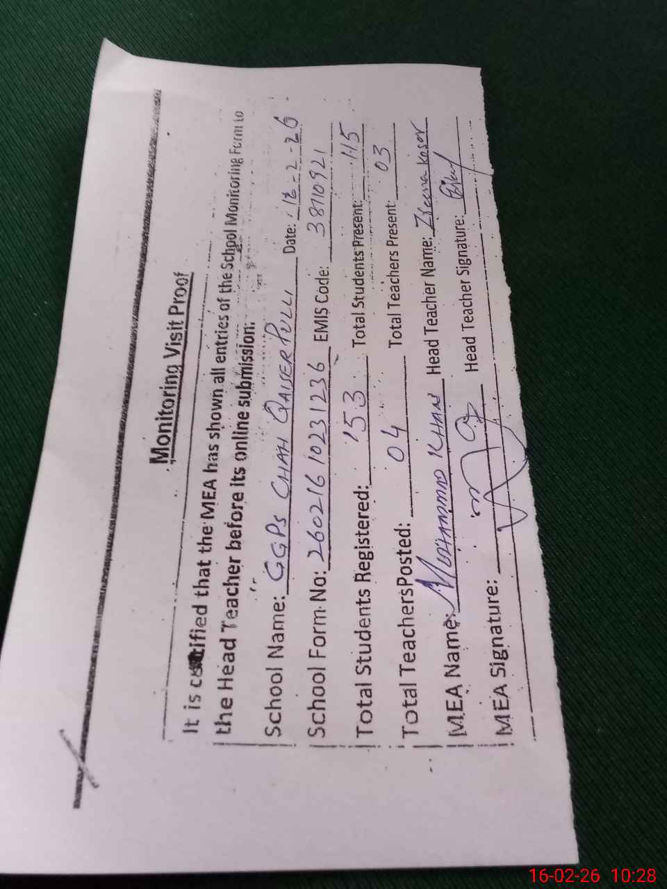 | Monitoring Date: 16-02-2026 | Start Time: 16-02-2026 10:00 AM | End Time: 16-02-2026 10:32 AM | Name of MEA: Mu**** Kh**** | |