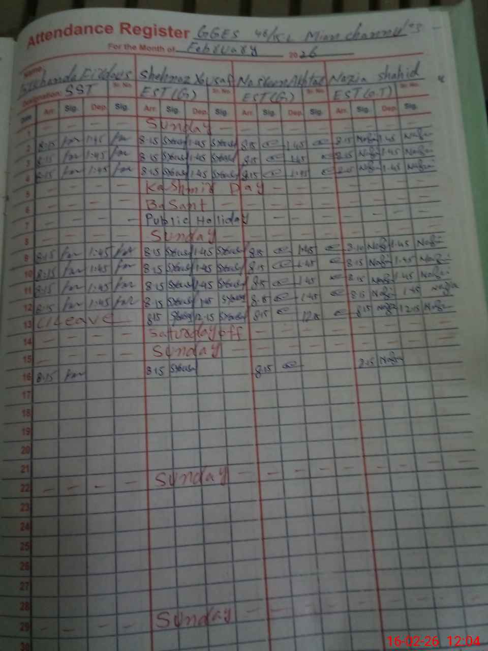| CNIC | Full Name | Designation | R/C | Absence During Last Calender Month |
