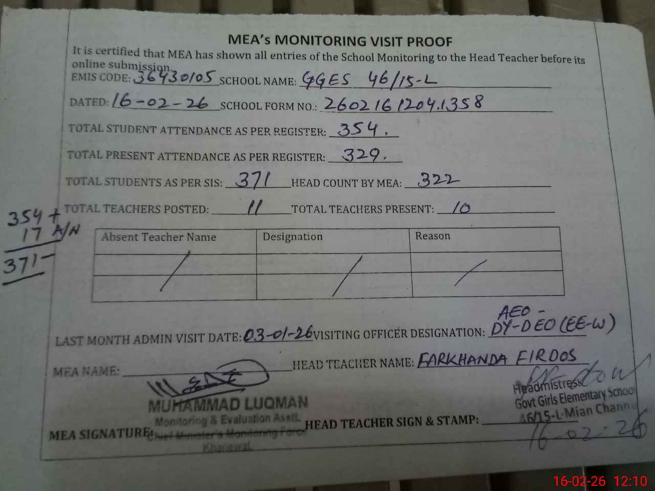 | Attendance Register | Head Teacher | MEA with School | Visit Proof |