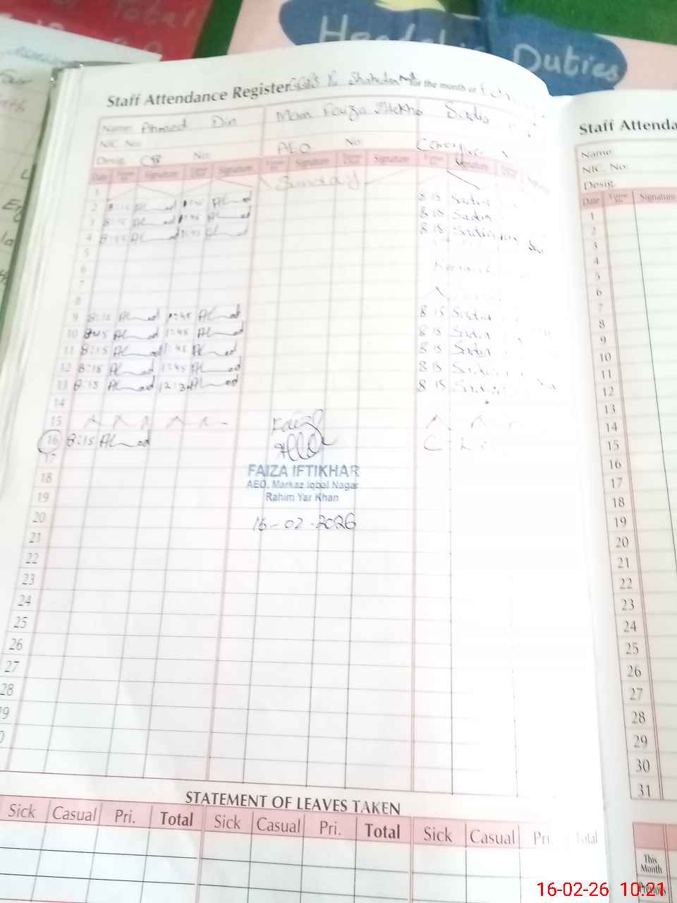 | Leave | Duty | Absent | Maternity | Medical | Ex- Pak |