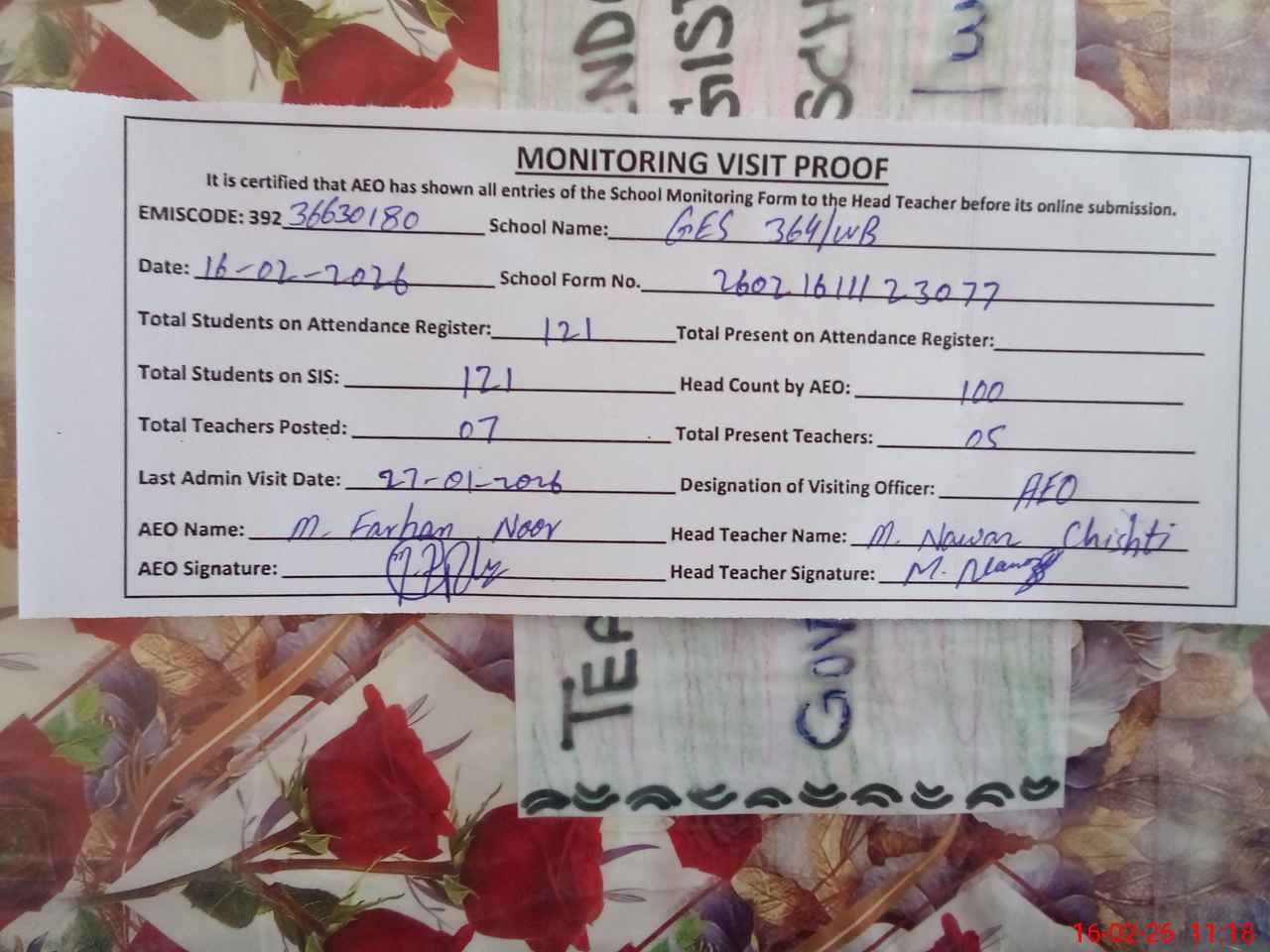 | Attendance Register | Head Teacher | MEA with School | Visit Proof |