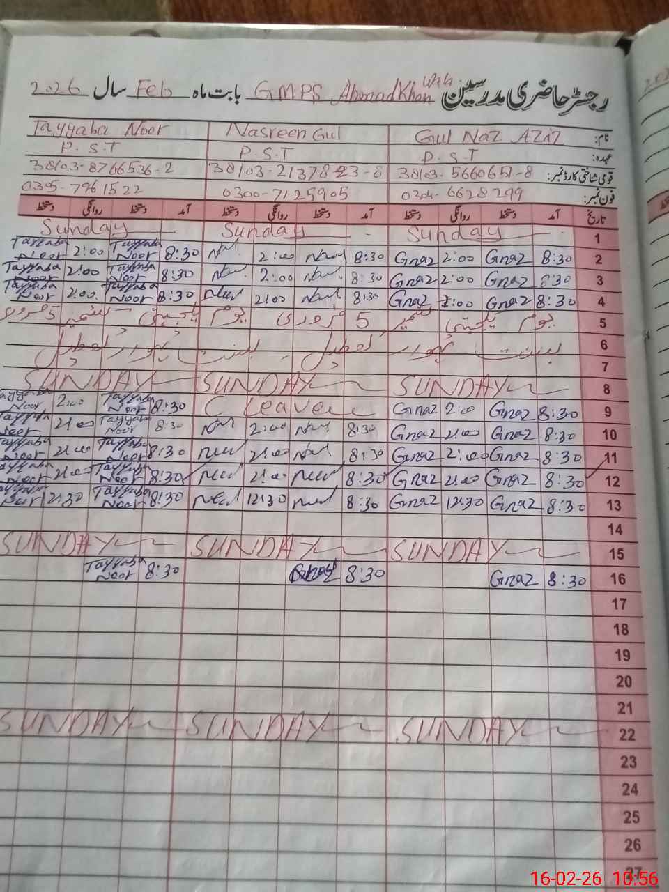 | CNIC | Full Name | Designation | R/C | Absence During Last Calender Month |