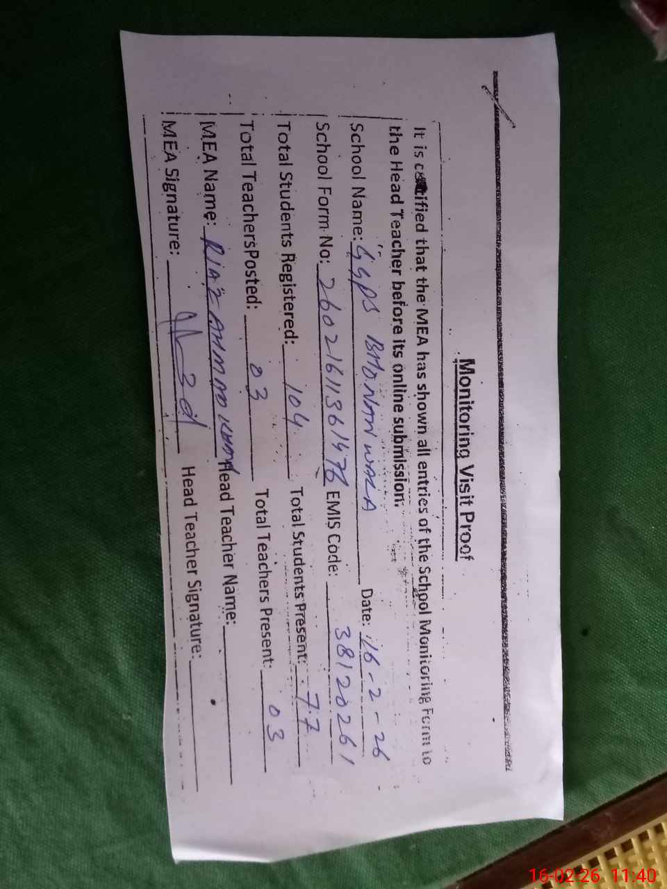| EMIS Code: 38120261 | Name of School: GGPS BHONAN WALA | |||