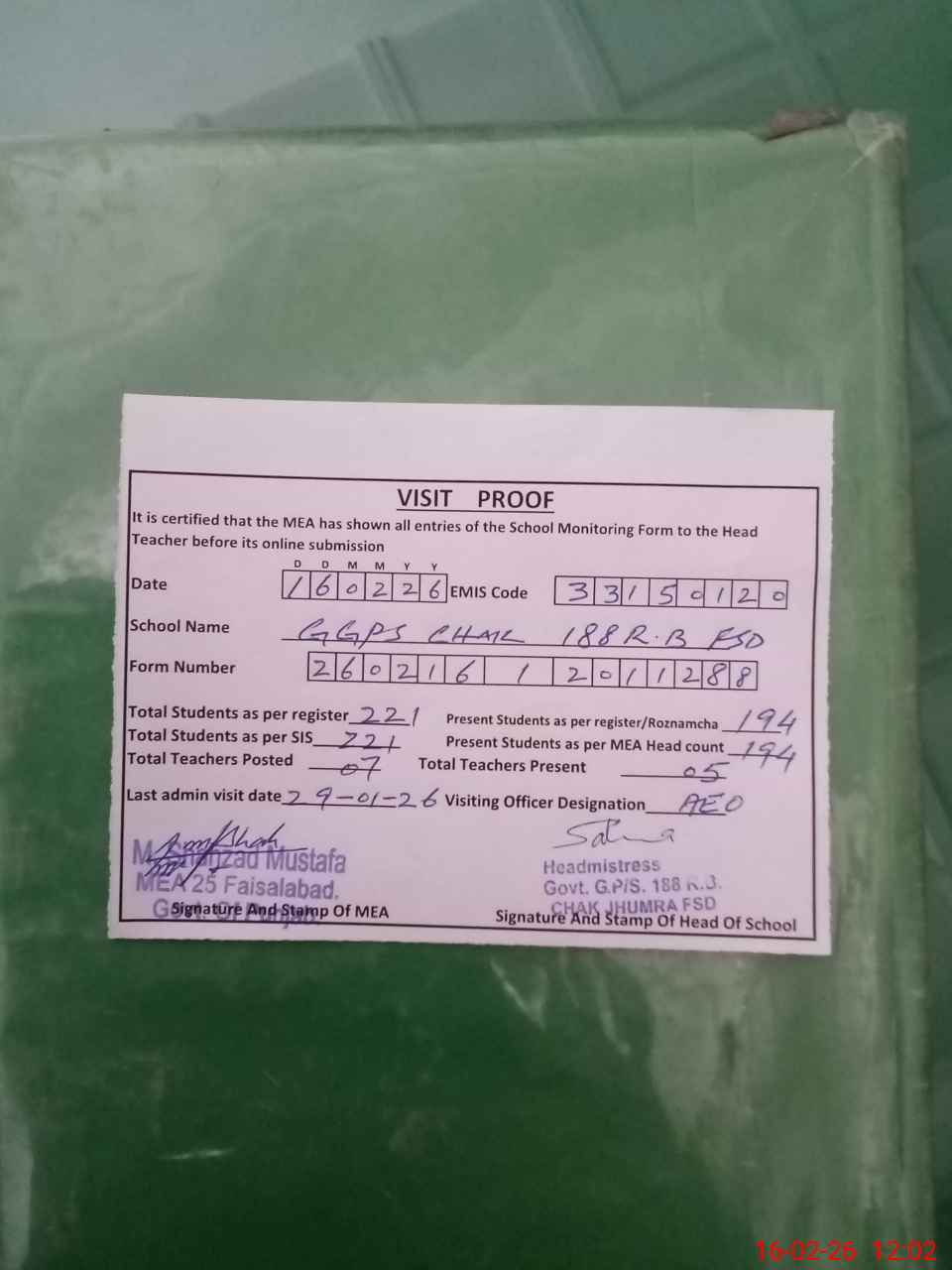 | EMIS Code: 33150120 | Name of School: GGPS CHAK NO 188 RB | |||