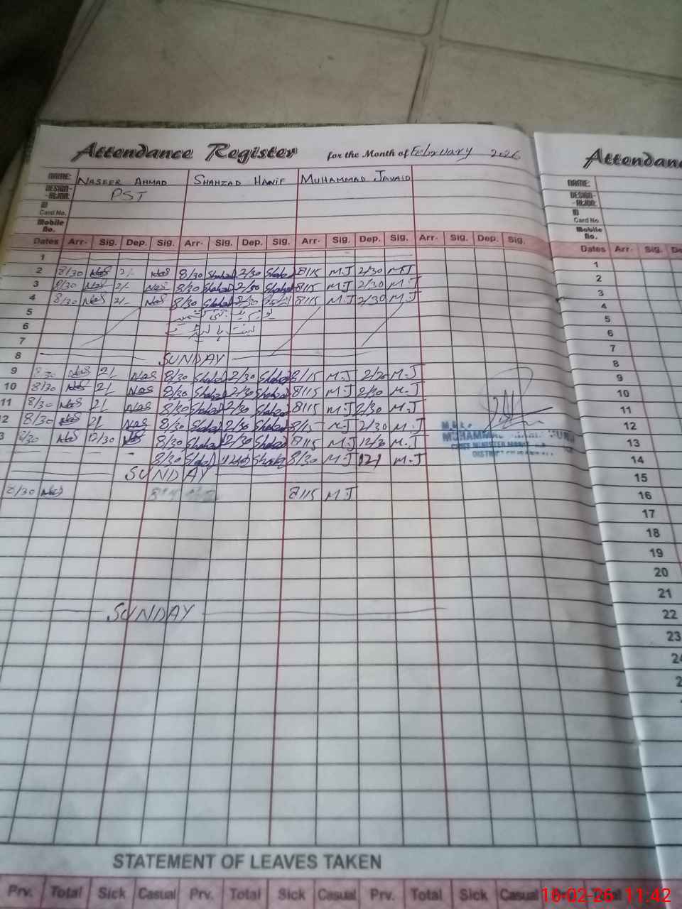 | CNIC | Full Name | Designation | R/C | Absence During Last Calender Month |