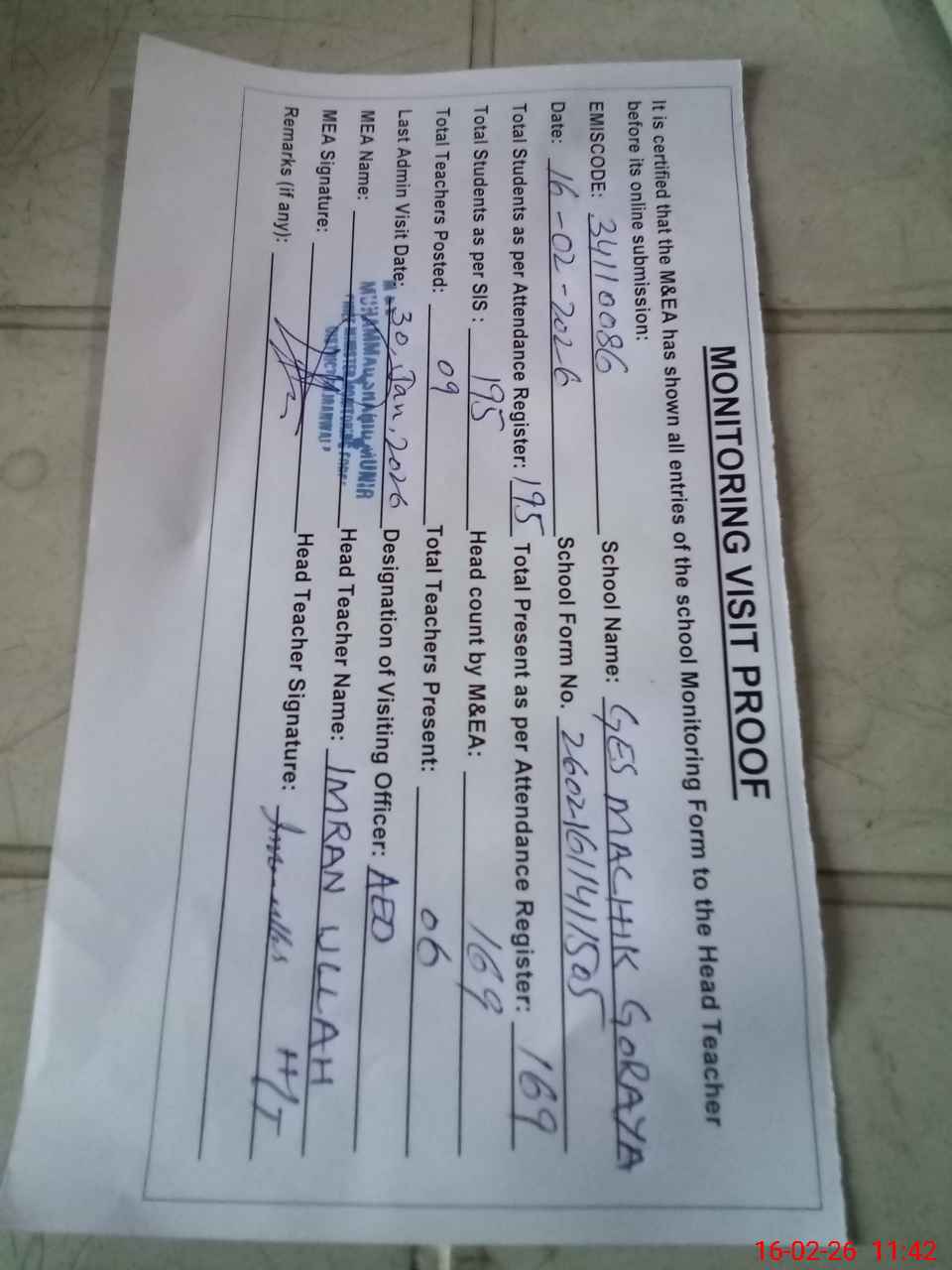 | Attendance Register | Head Teacher | MEA with School | Visit Proof |