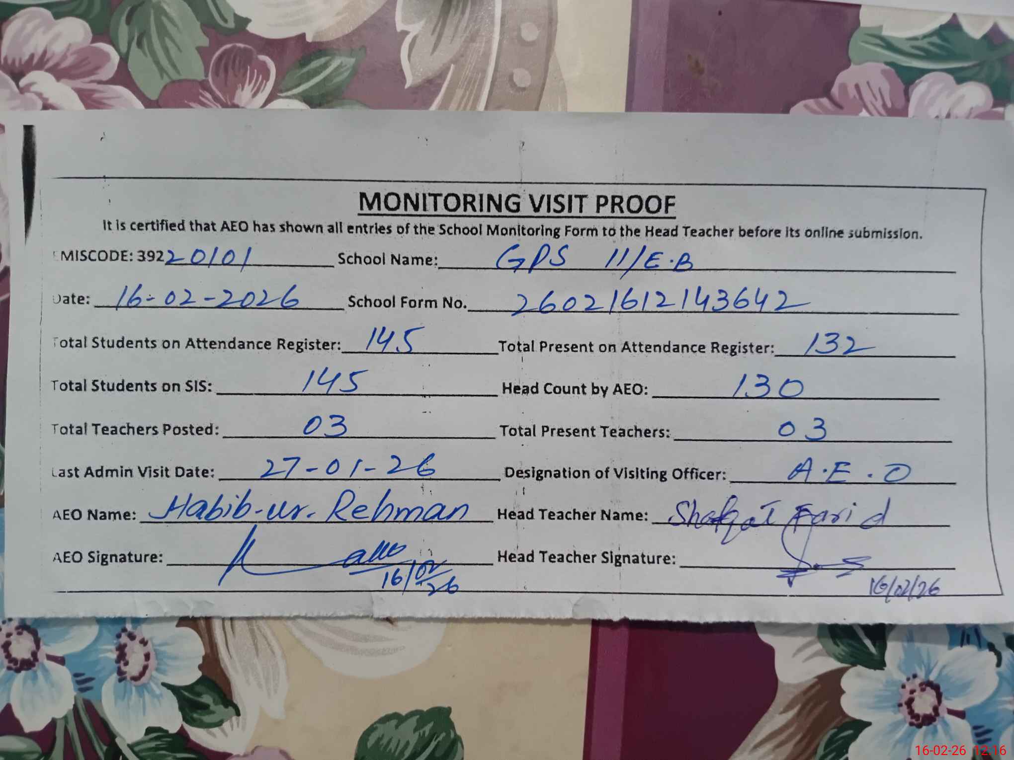 | Attendance Register | Head Teacher | MEA with School | Visit Proof |