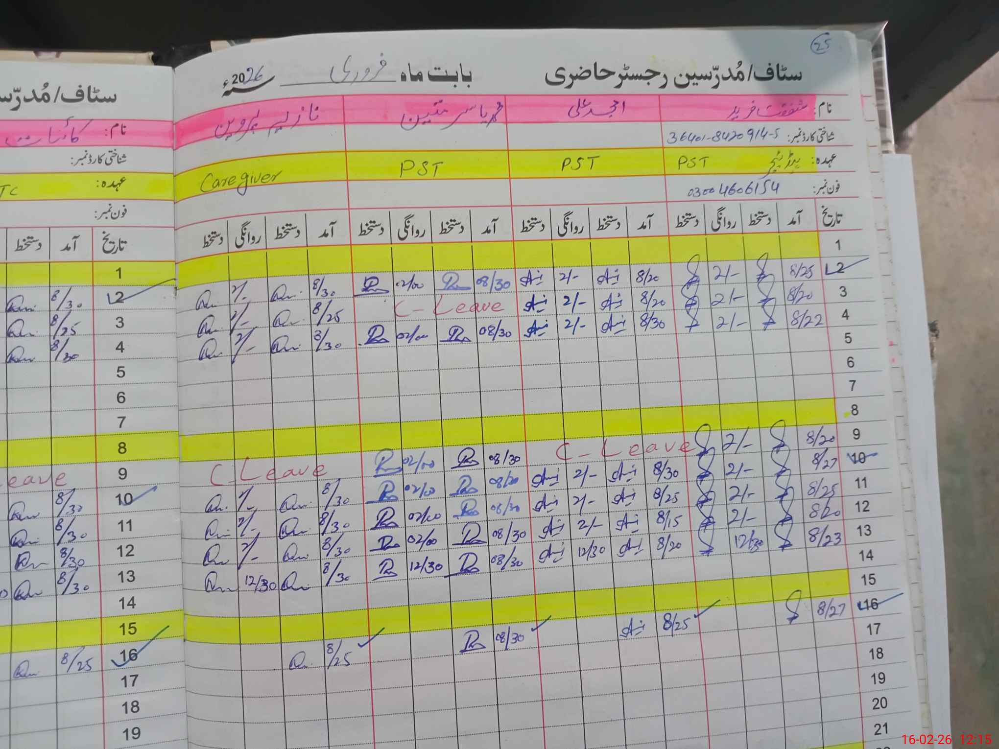| CNIC | Full Name | Designation | R/C | Absence During Last Calender Month |