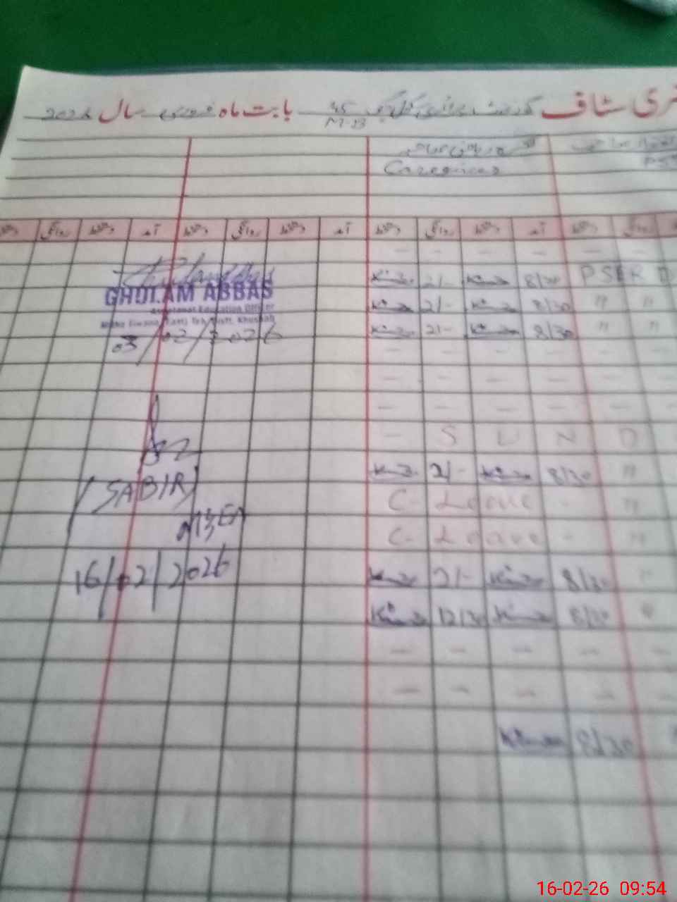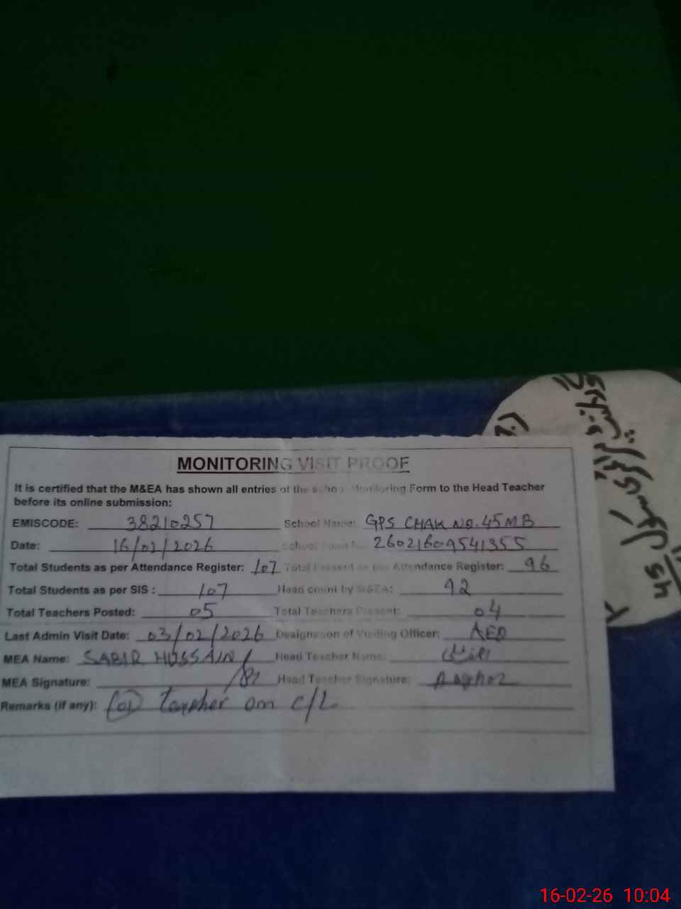 | Remarks (Use Separate Page if Required): no teacher absent total students on register 107 total students on SiS 107 last admin visit by AEO on 03 Feb 2026 | |||||
