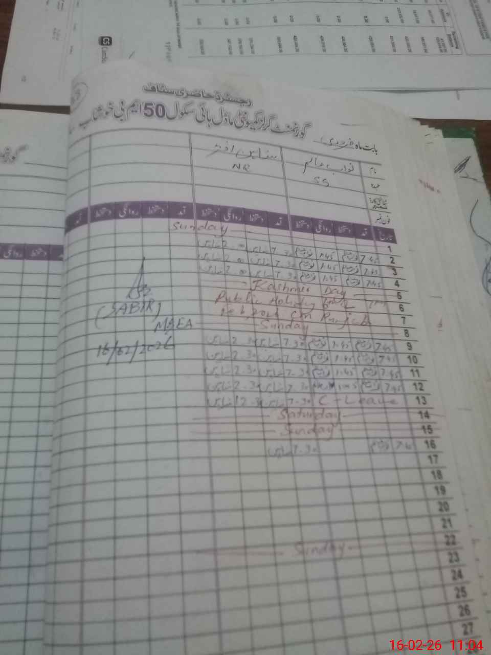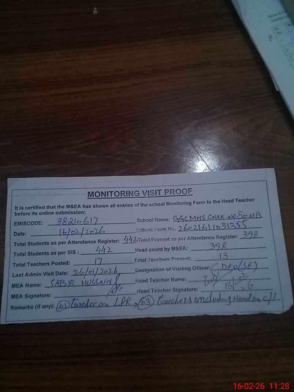 | Remarks (Use Separate Page if Required): no teacher absent total students on register 442 total students on SiS 442 last admin visit by DEO on 26 Jan 2026 | |||||