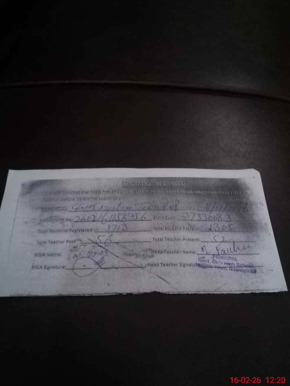 | Name: MR**** Fa**** Designation: (School Headmaster's/Headmistress's) Ic Incharge Phone/Cell Number: 03**** |