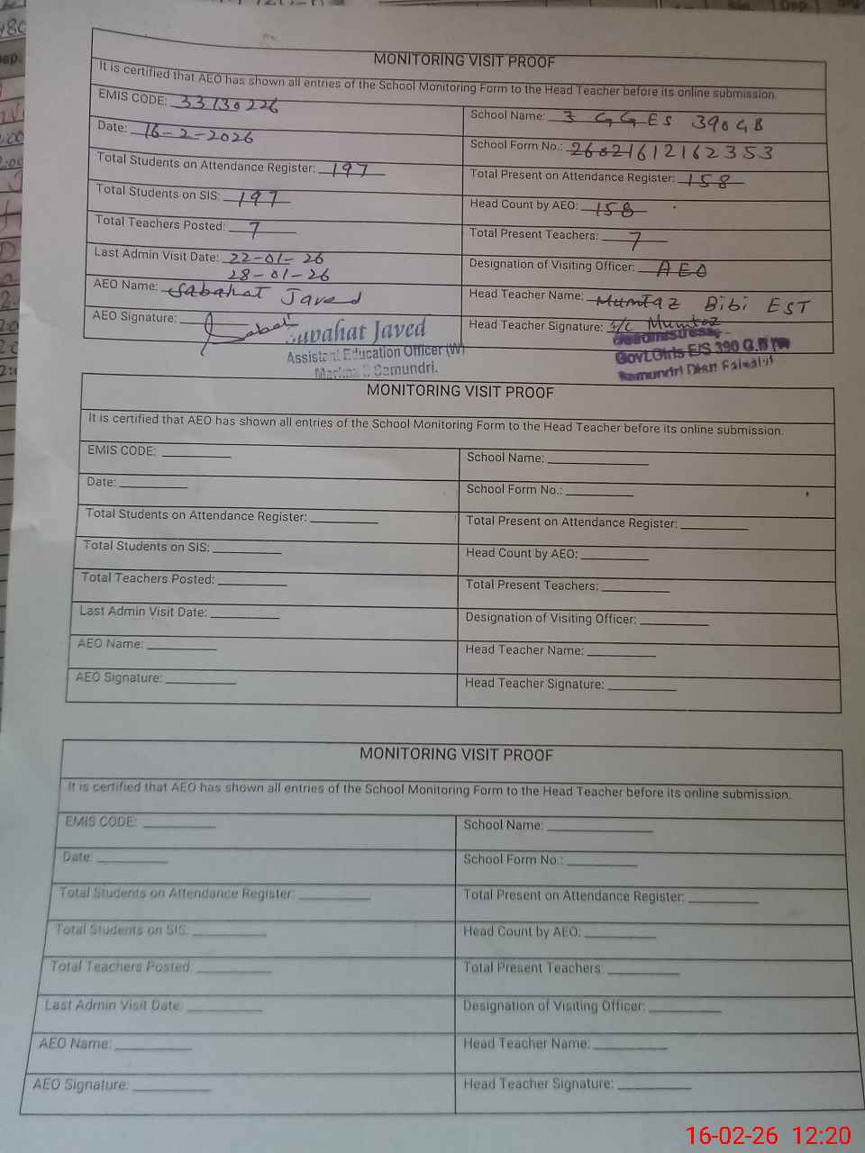 | EMIS Code: 33130226 | Name of School: GGES CHAK 390 GB I SAMUNDRI | |||