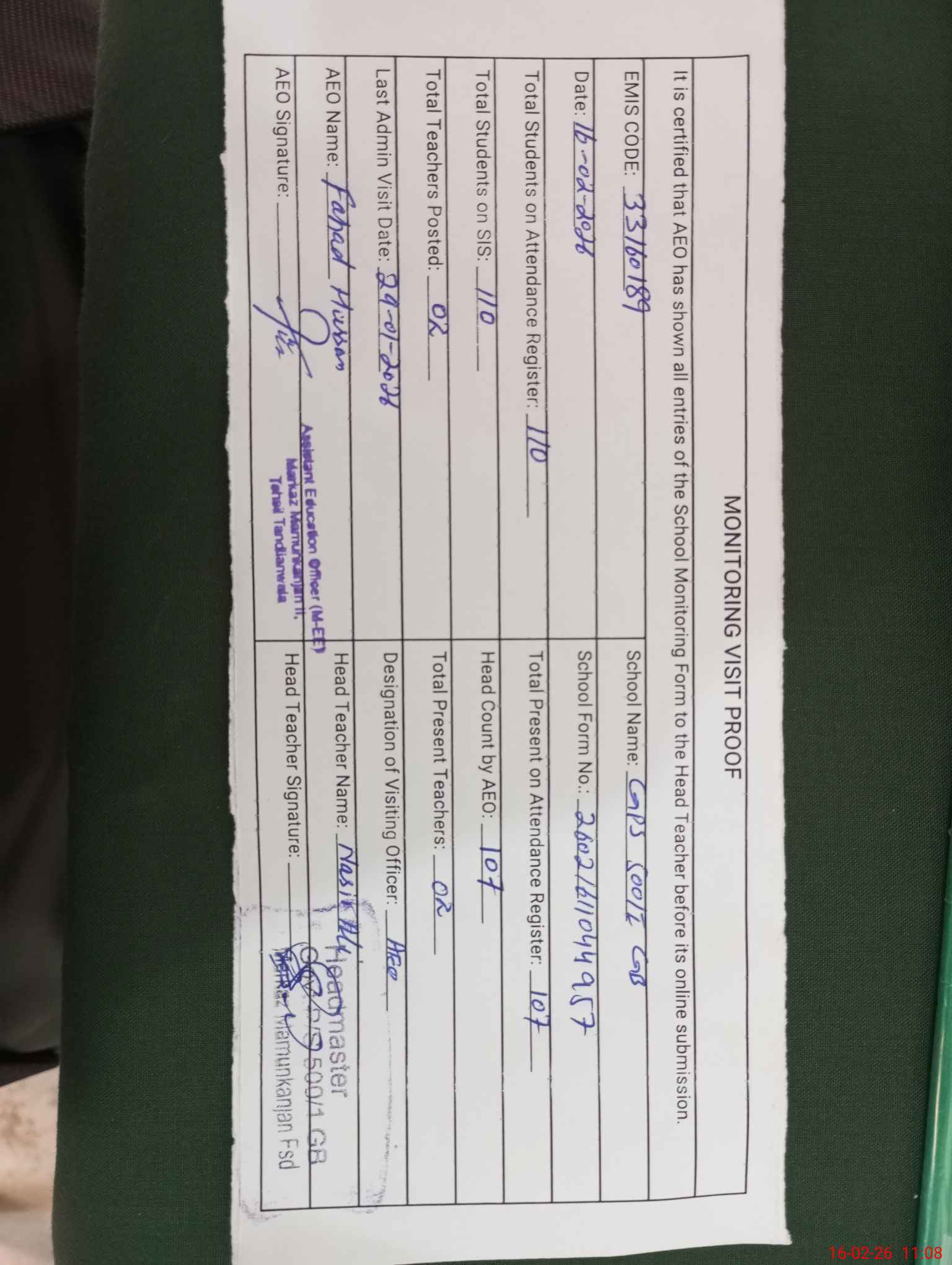 | EMIS Code: 33160189 | Name of School: GPS CHAK 500 GB I MAMUNKANJAN | |||