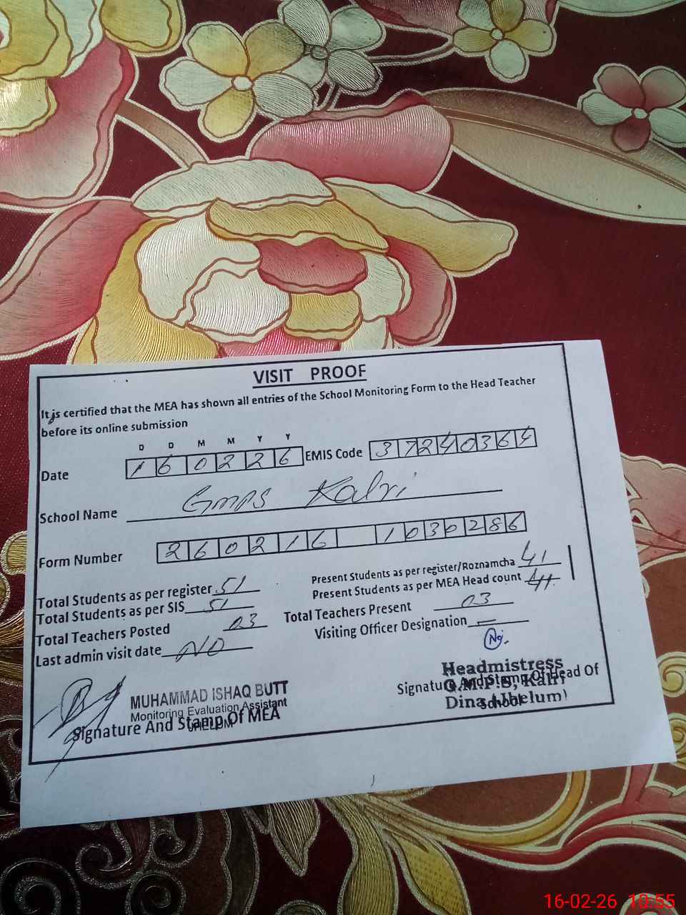| Certified that this School was Inspected by the Undersigned MEA/DMO Today and the Information Stated Above is as Per Record. | |||||