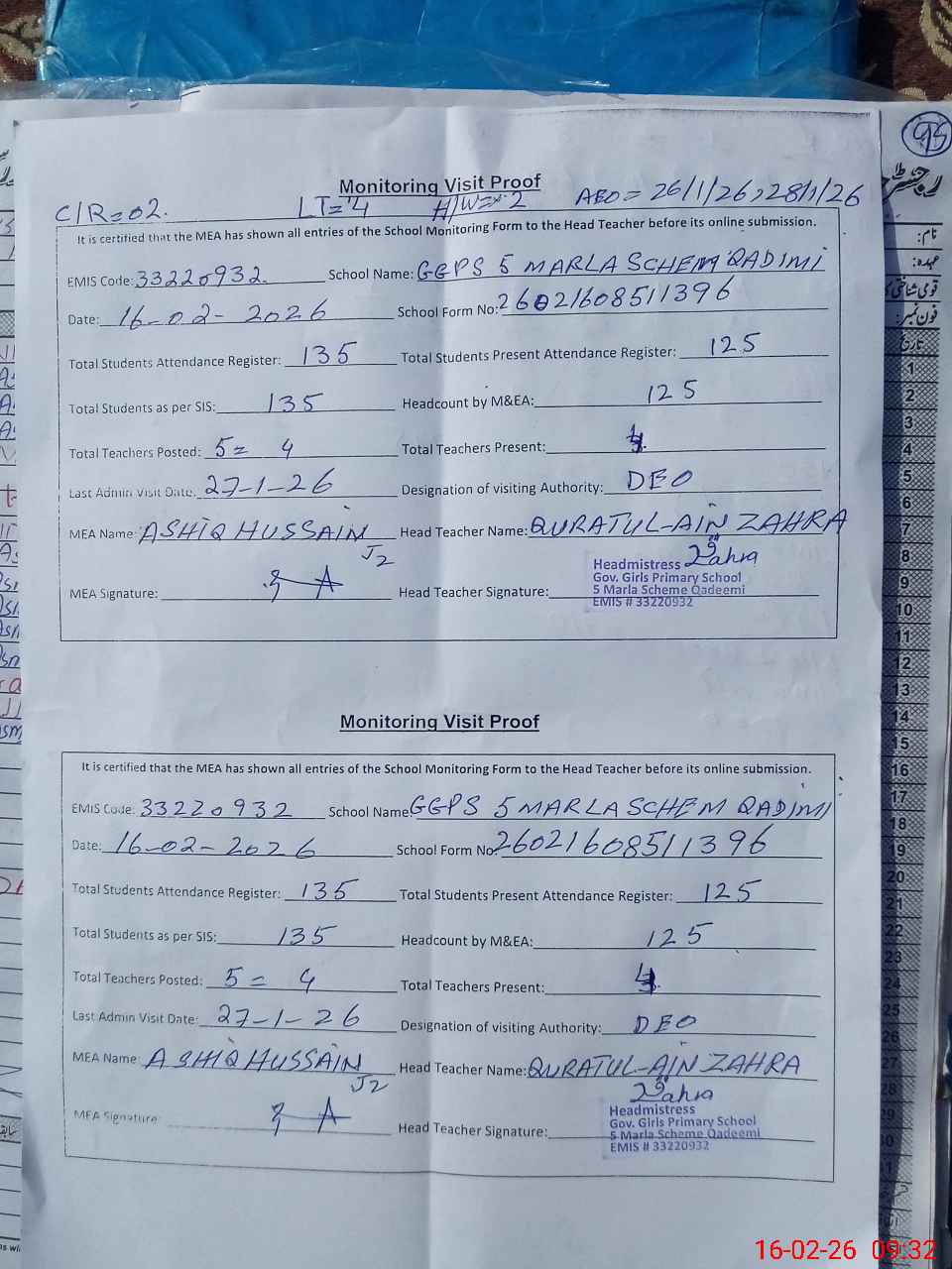 | EMIS Code: 33220932 | Name of School: GGPS 5 MARLA SCHEME QADIMI | |||