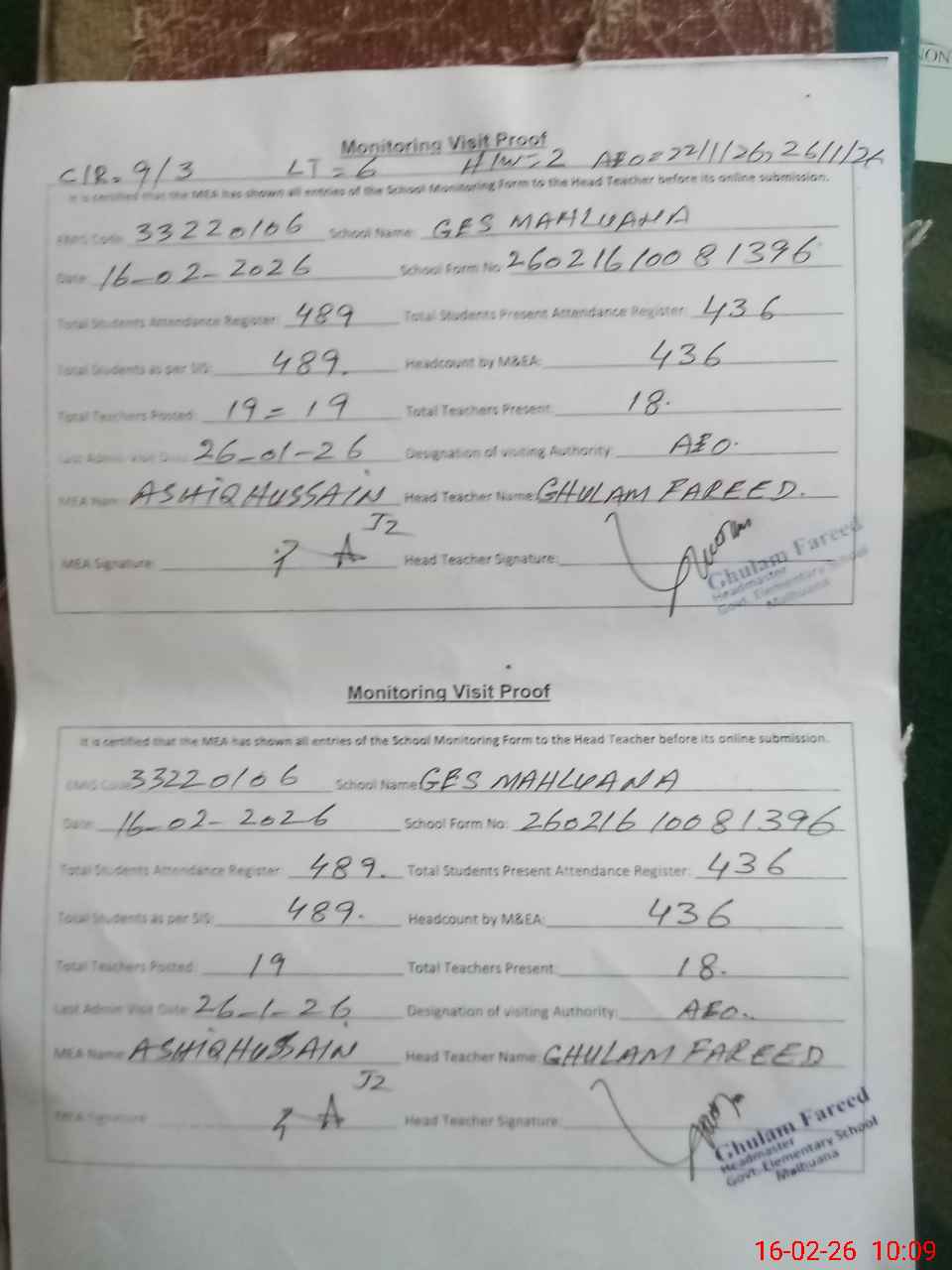 | Attendance Register | Head Teacher | MEA with School | Visit Proof |