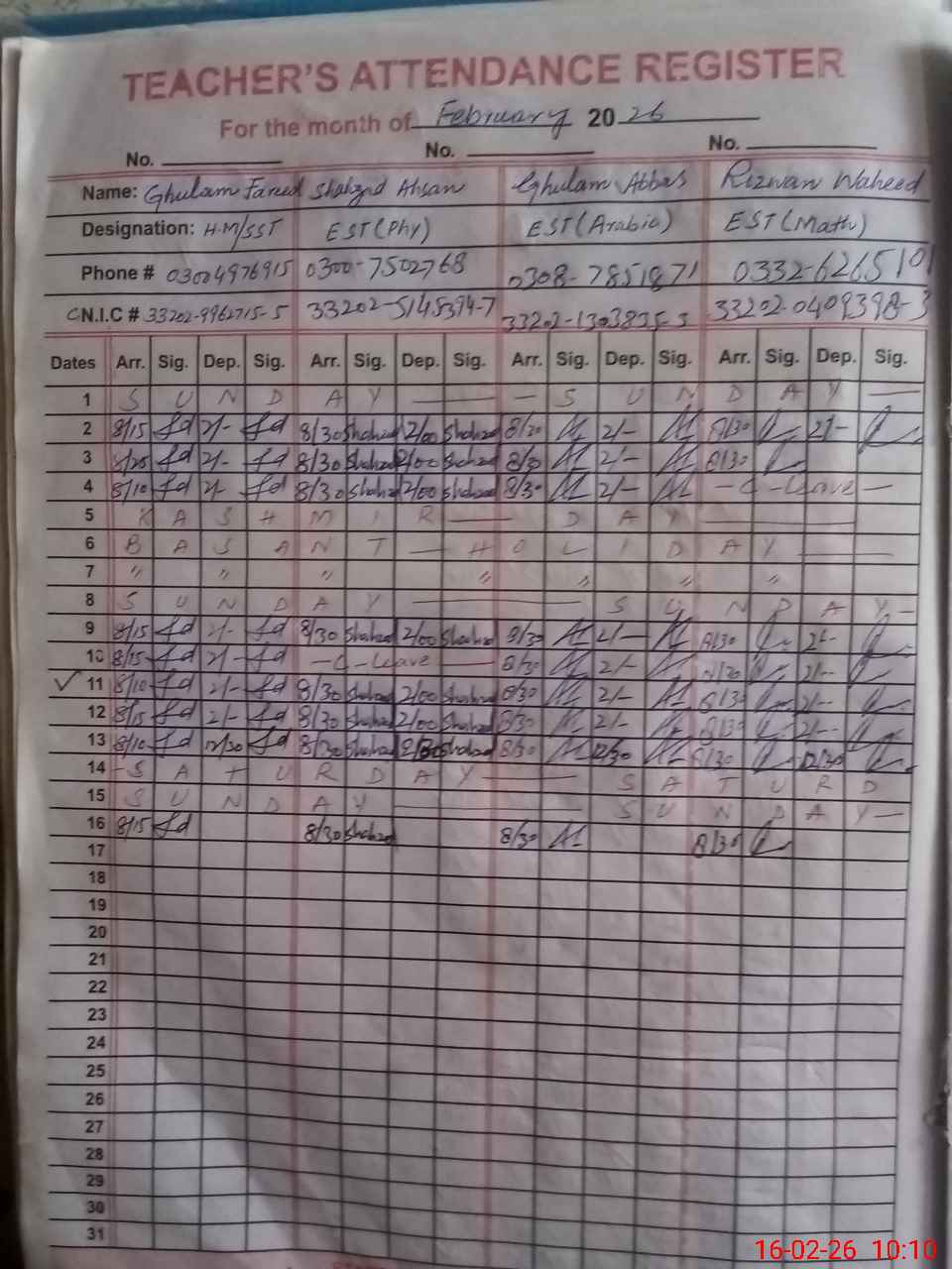 | CNIC | Full Name | Designation | R/C | Absence during last cal. month |