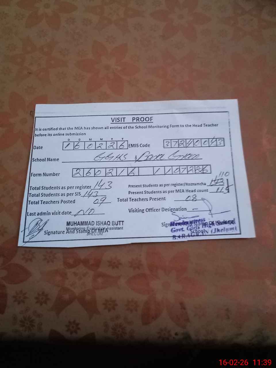 | Attendance Register | Head Teacher | MEA with School | Visit Proof |
