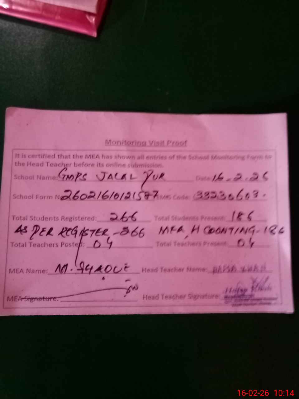 | Attendance Register | Head Teacher | MEA with School | Visit Proof |