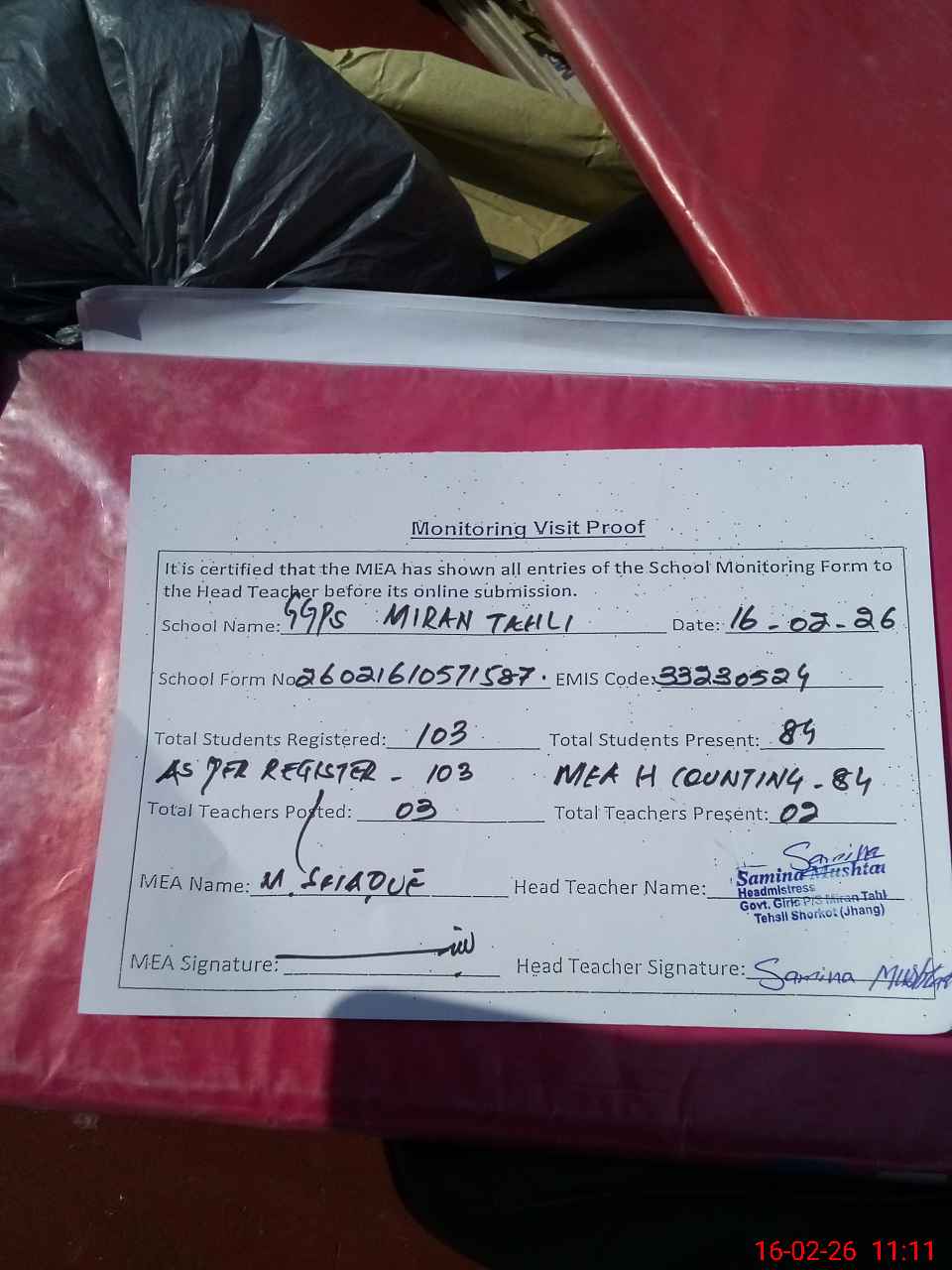 | EMIS Code: 33230524 | Name of School: GGPS DARBAR MIRAN TAHLI | |||