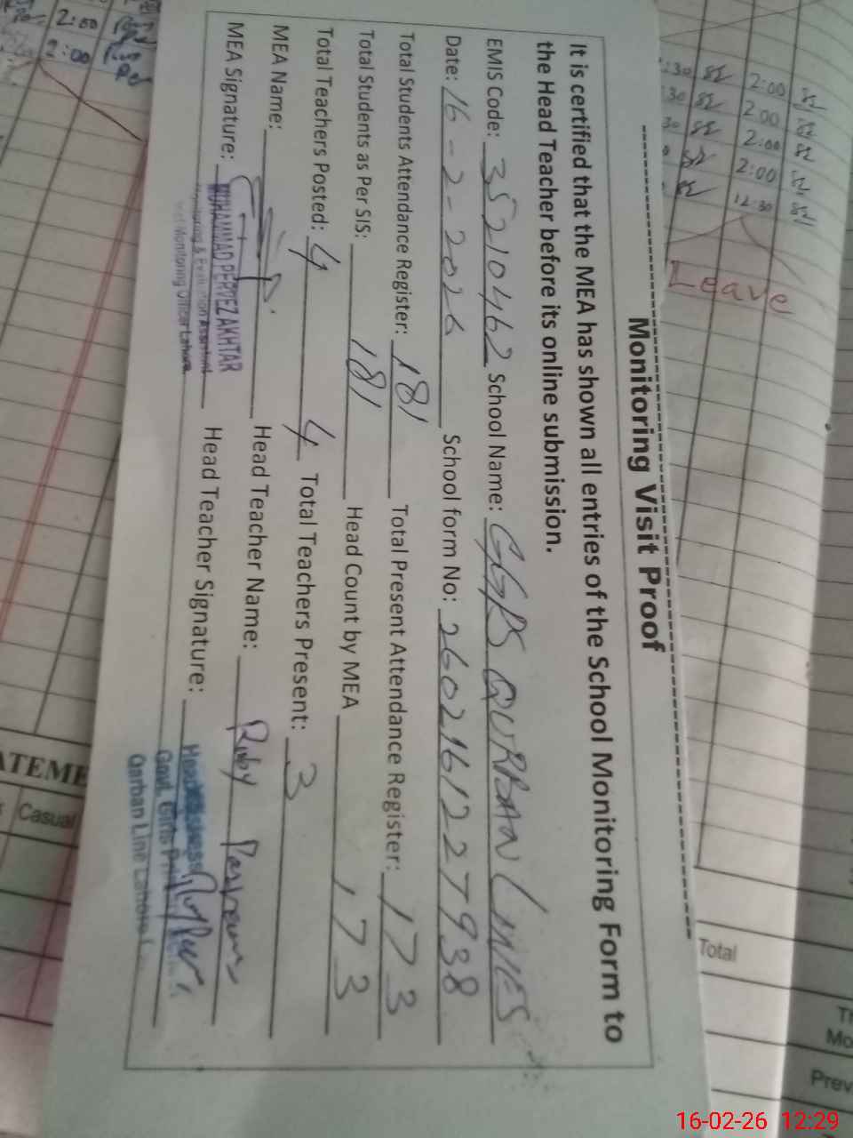| Attendance Register | Head Teacher | MEA with School | Visit Proof |
