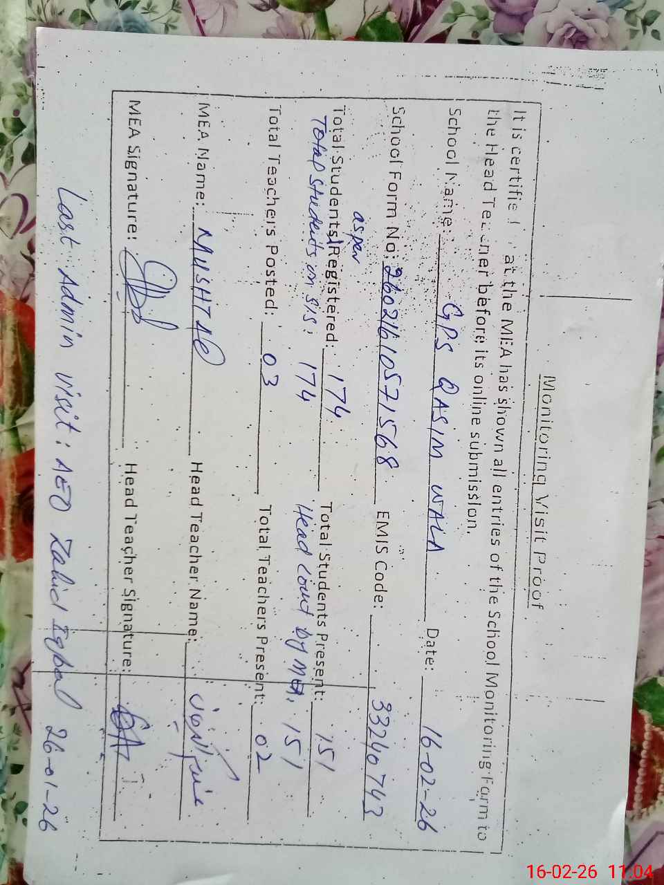 | EMIS Code: 33240743 | Name of School: GPS QASIM WALA | |||