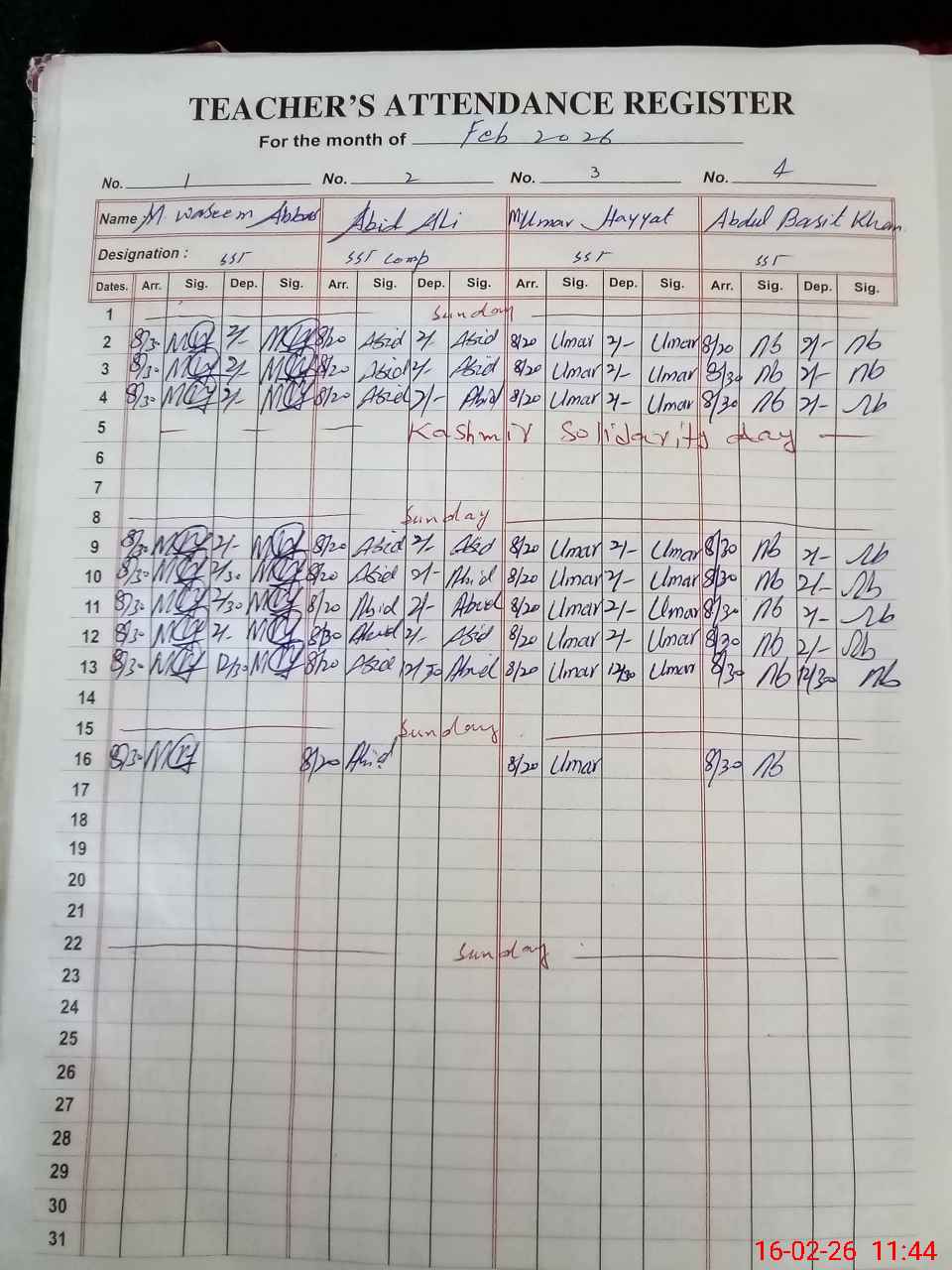 | No. of Students Present - Female | 0 | 0 | 0 | 0 | 0 | 0 | 0 | 0 | 0 | 0 | 0 | 0 | 0 | 0 | 0 | |