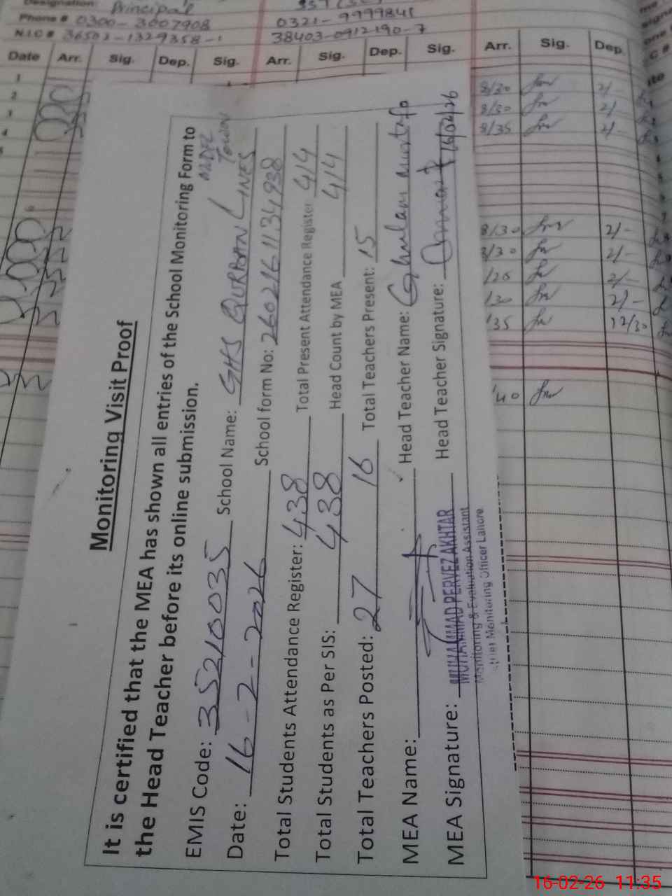 | Attendance Register | Head Teacher | MEA with School | Visit Proof |