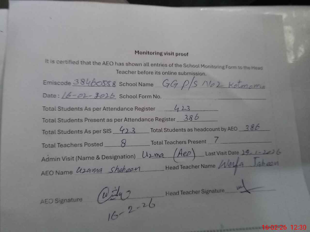 | Certified that this School was Inspected by the Undersigned MEA/DMO Today and the Information Stated Above is as Per Record. | |||||