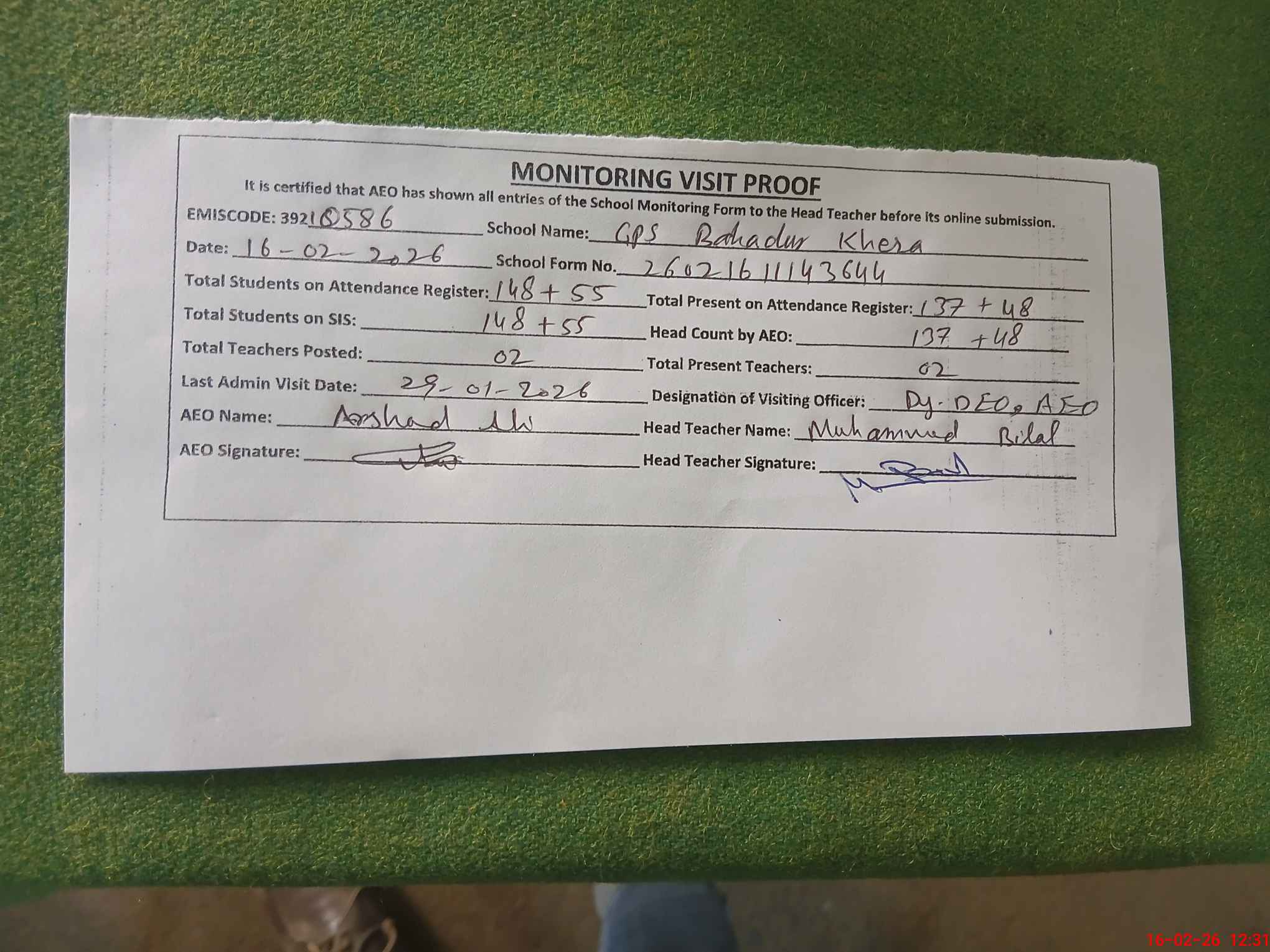 | Attendance Register | Head Teacher | MEA with School | Visit Proof |