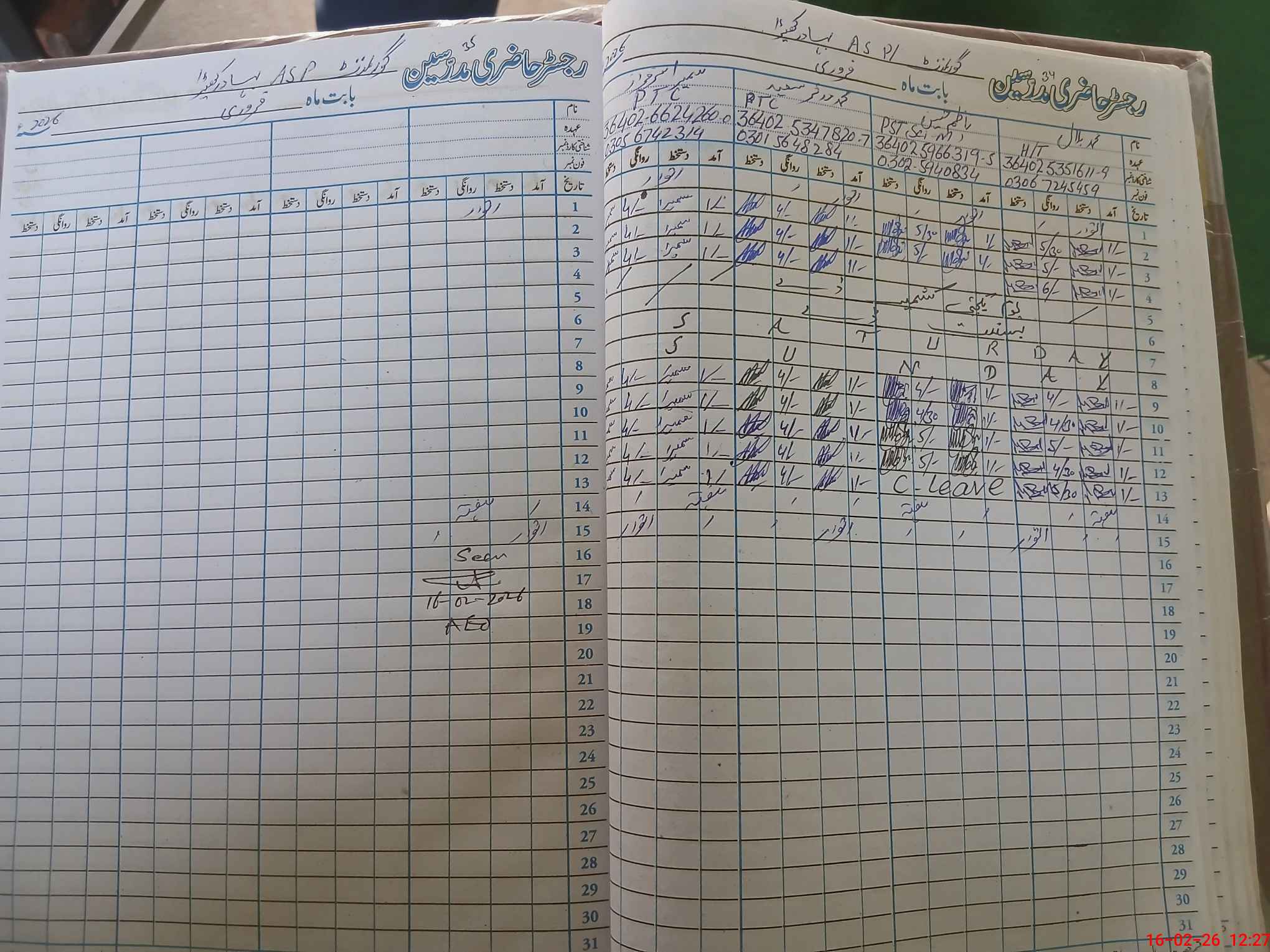 | CNIC | Full Name | Designation | R/C | Absence during last cal. month |